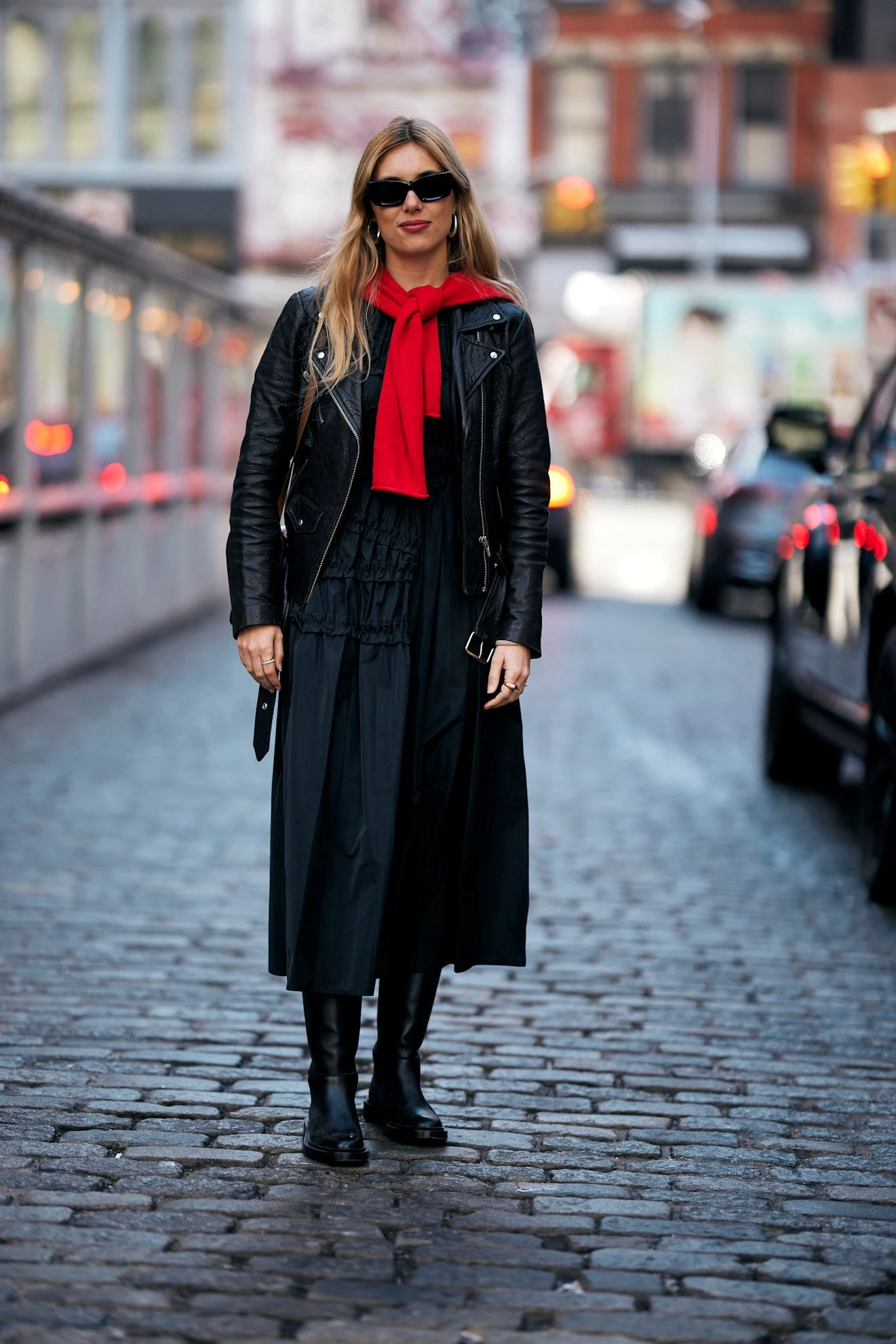Логічне продовження попередніх образів – замінити довгу спідницю на міні або навіть мікрошорти. Тут щільні чорні колготи відіграють ключову роль, щоб експеримент не завершився переохолодженням. Шкіряна куртка або багатошаровість, наприклад, смугаста сорочка під червоним светром, додають образу глибини. І на завершення грубі черевики чи чоботи kitten heels – будь-яке взуття працюватиме.