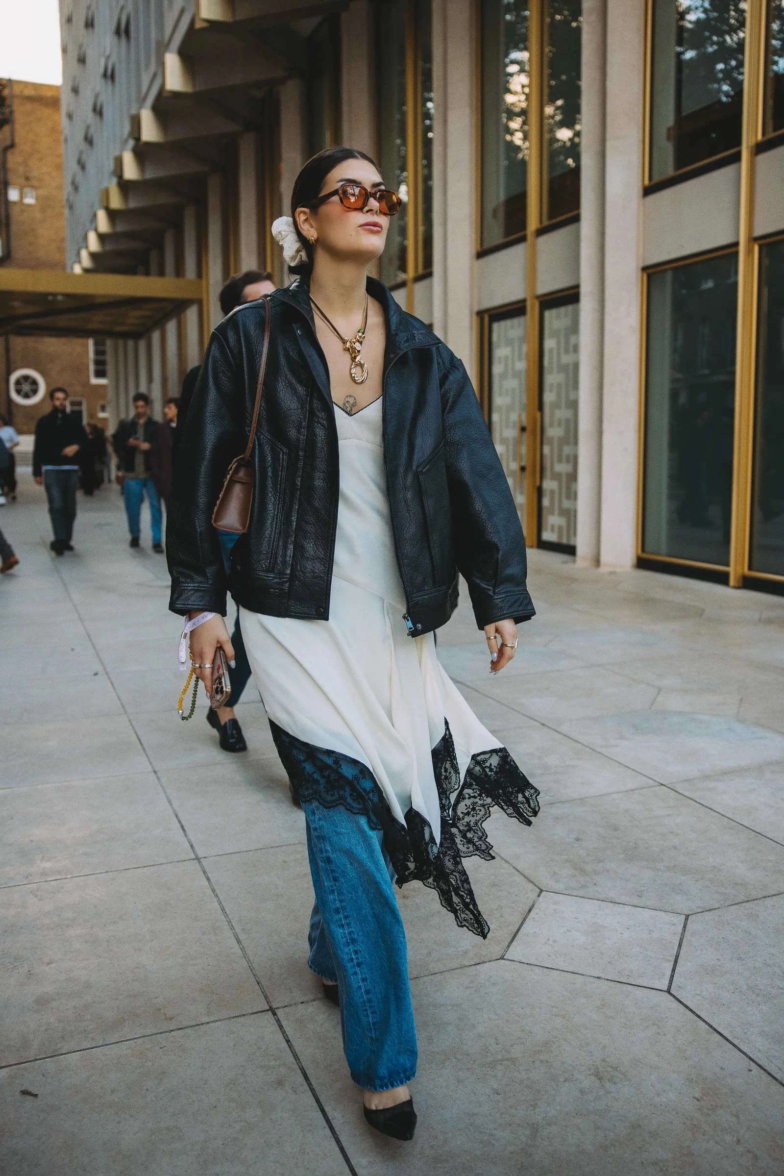Неочікуване, але напрочуд ефектне поєднання. Атласна або мереживна сукня-комбінація поверх деніму додає образу жіночності й легкої богемності. Оберіть джинси прямого крою й доповніть образ взуттям на підборах.