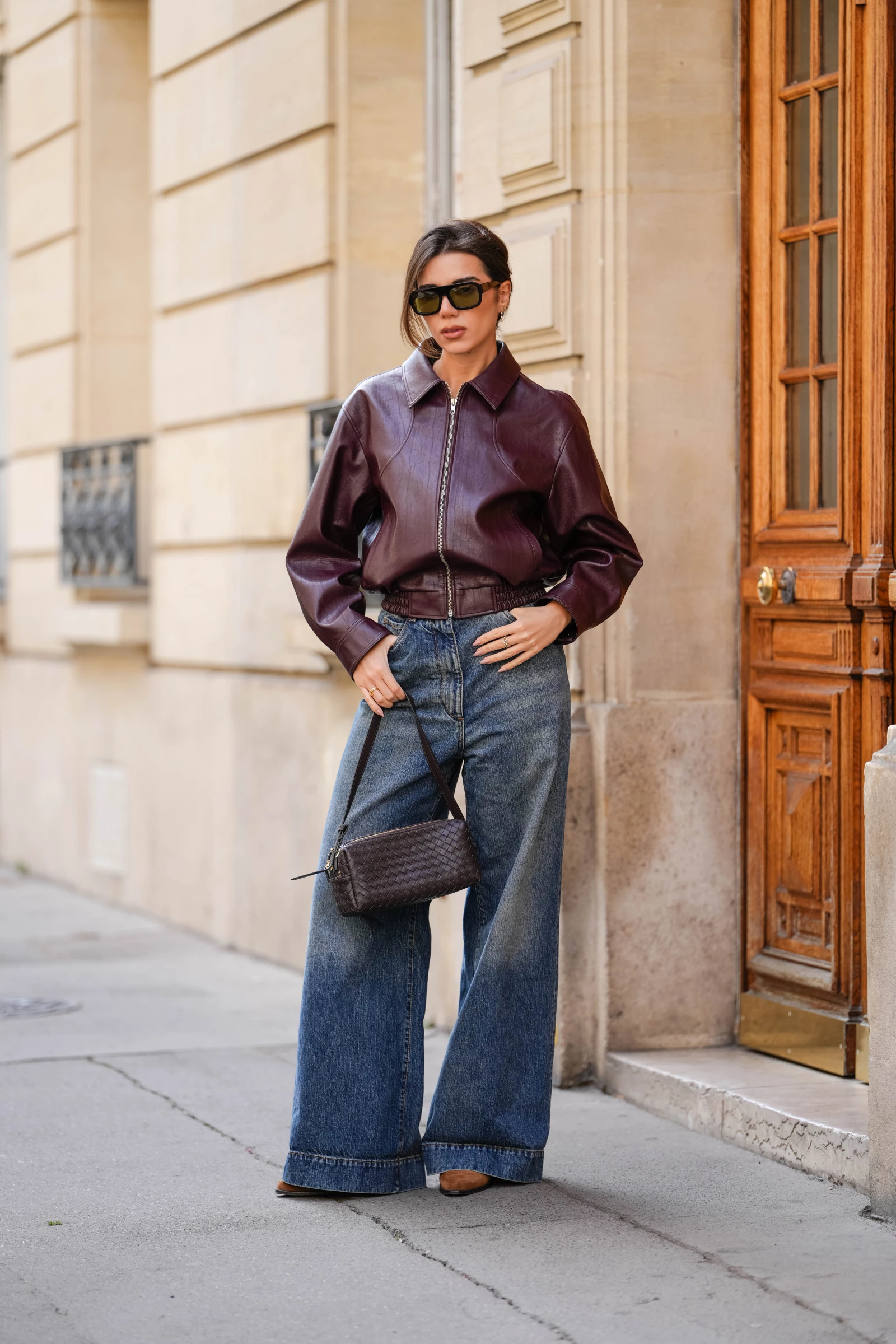 Укорочений бомбер у глибокому відтінку бордо створює гармонійний контраст із джинсами кльош із високою посадкою. Завершити образ допоможуть замшеві чоботи, маленька сумка в тон і великі окуляри.