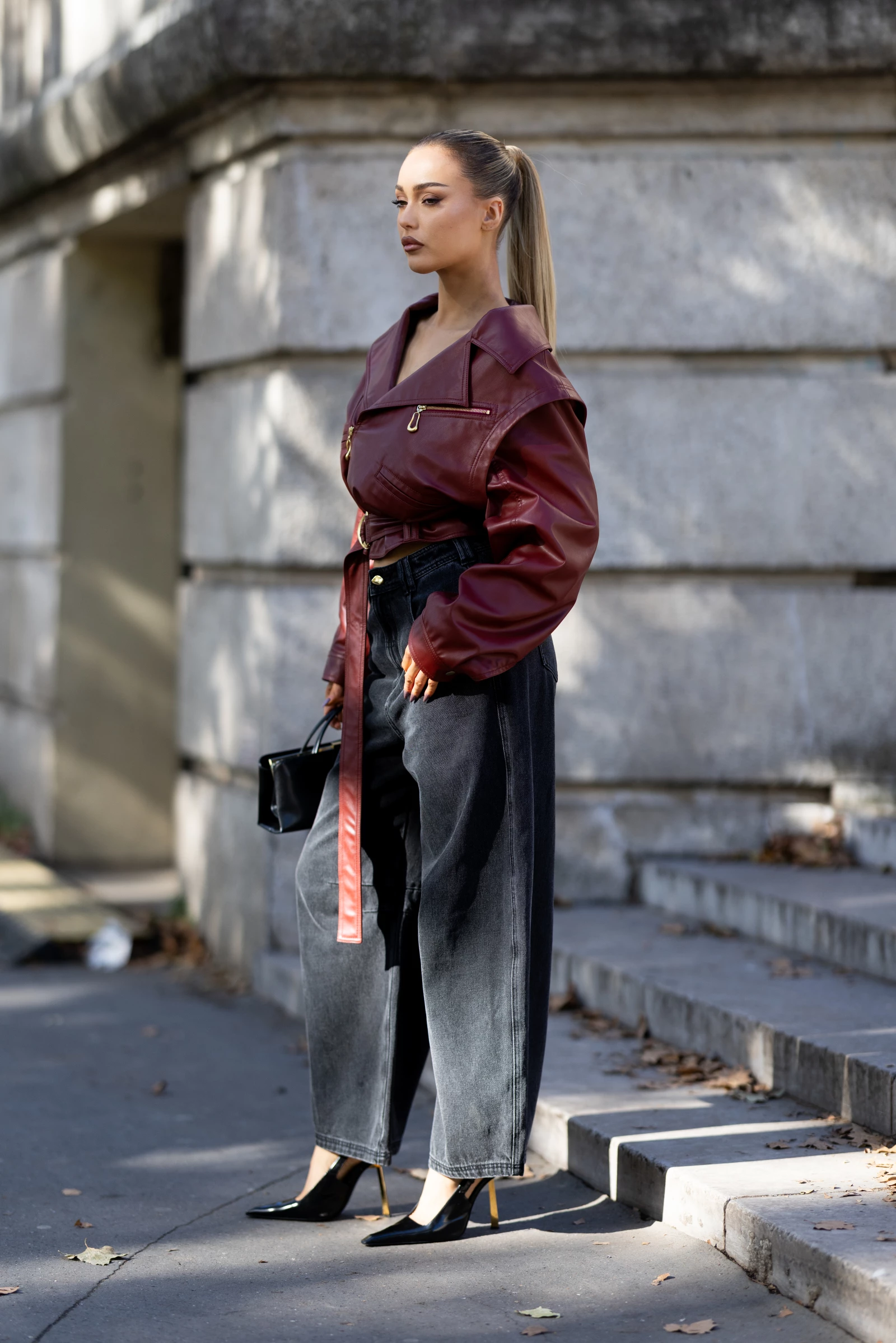 Насичений відтінок червоного вина й золотиста фурнітура куртки нагадують про стиль 1980-х і образи Мадонни чи Сінді Лопер. Найкраще поєднання – з темними джинсами "підковами" з м’яко звуженою штаниною. Щоб зберегти пропорції, доповніть образ взуттям на підборах – воно візуально подовжить силует.