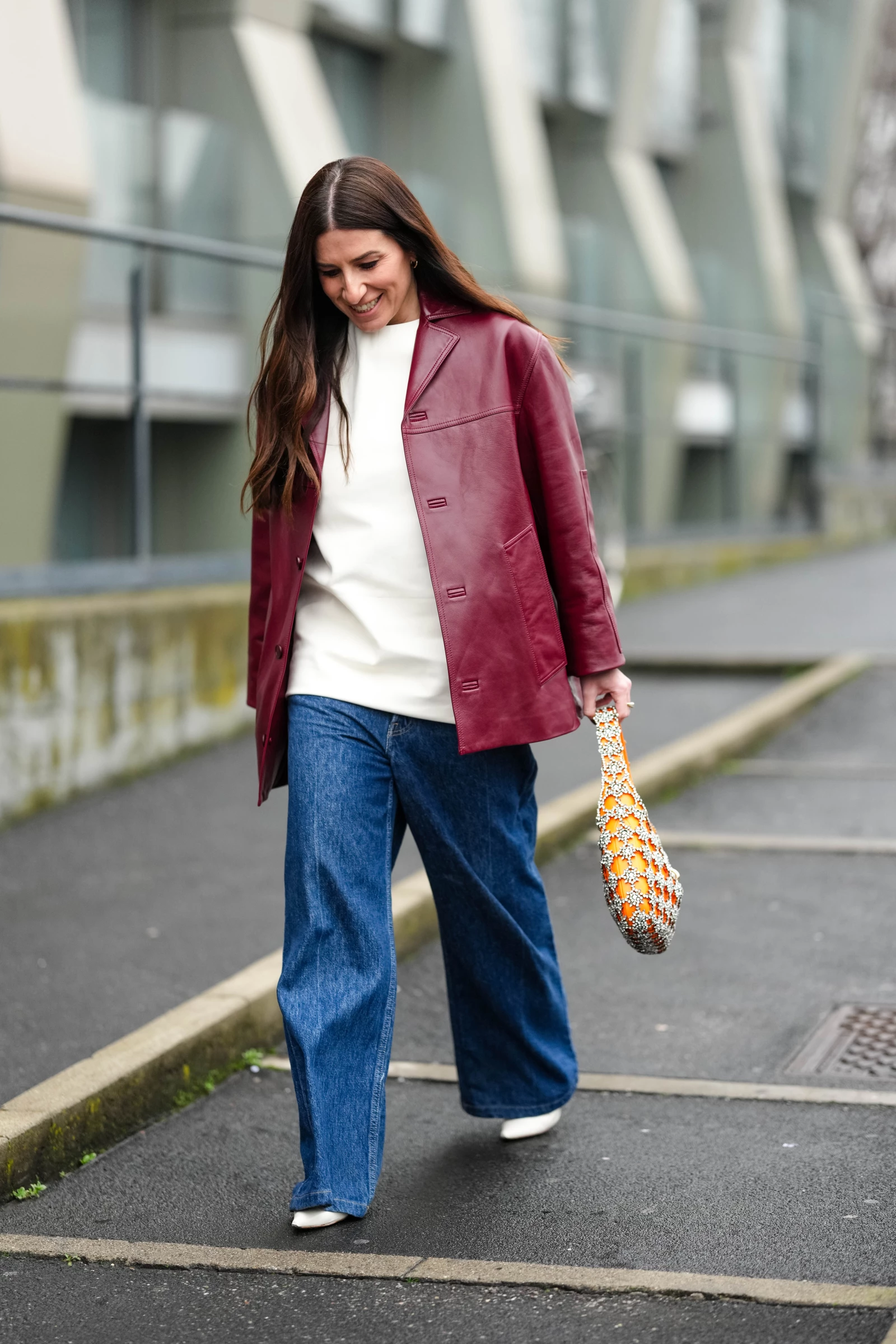 Ця комбінація – ідеальне поєднання для офісу й прохолодних днів. Тандем бордо та індиго – один із найвишуканіших кольорових союзів сезону. У варіанті з курткою у стилі вінтажного жакета та широкими джинсами wide leg образ можна легко адаптувати під робочі будні – достатньо додати улюблений светр або сорочку й черевики на підборах.