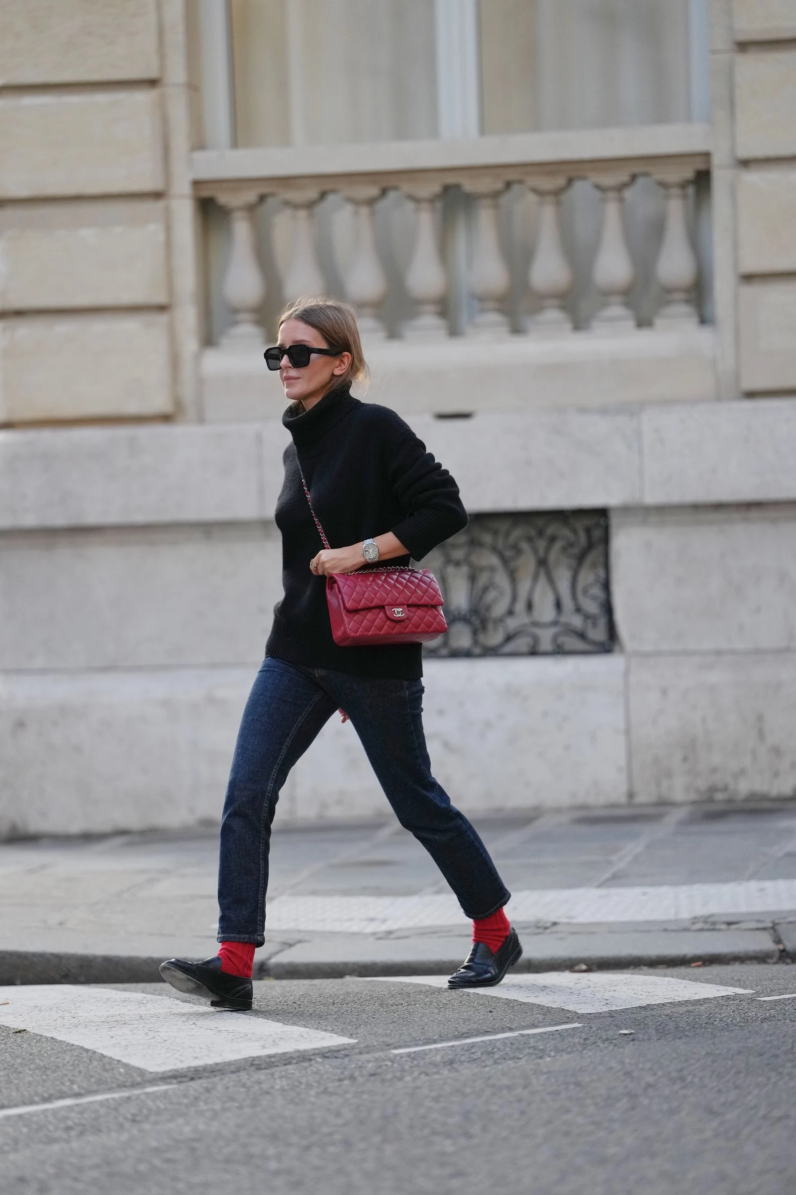 Лофери – взуття, яке знову на піку популярності. Якщо їх ще немає у вашій шафі, готуйте wishlist. Вони стануть ключовими вже прийдешньої весни, але святковий сезон – ідеальний момент почати носити їх раніше. Лофери чудово працюють для неформальних зустрічей чи прогулянок містом, коли хочеться виглядати зібрано. У Парижі модниці їх носять із червоними аксесуарами, від шкарпеток до сумок, і це виглядає несподівано святково.