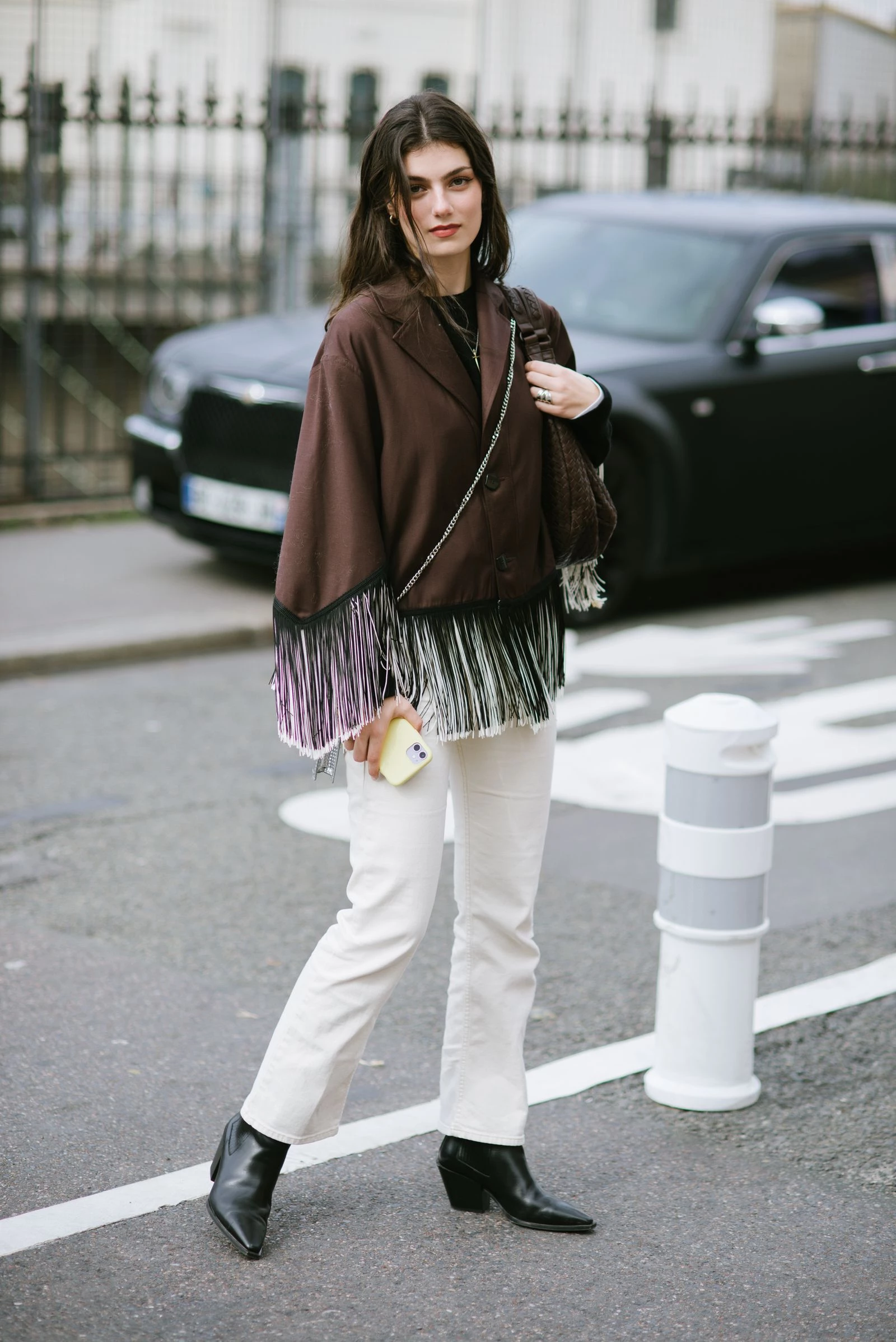 Цього сезону варто звернути увагу на cropped-моделі у парі з чоботами з гострим носком – такий стилістичний прийом додає кілька візуальних сантиметрів. Можна зіграти на контрасті кольорів або обрати монохром. Цього року актуальні й торочки – додайте її у жакеті чи блузі для трендового акценту.