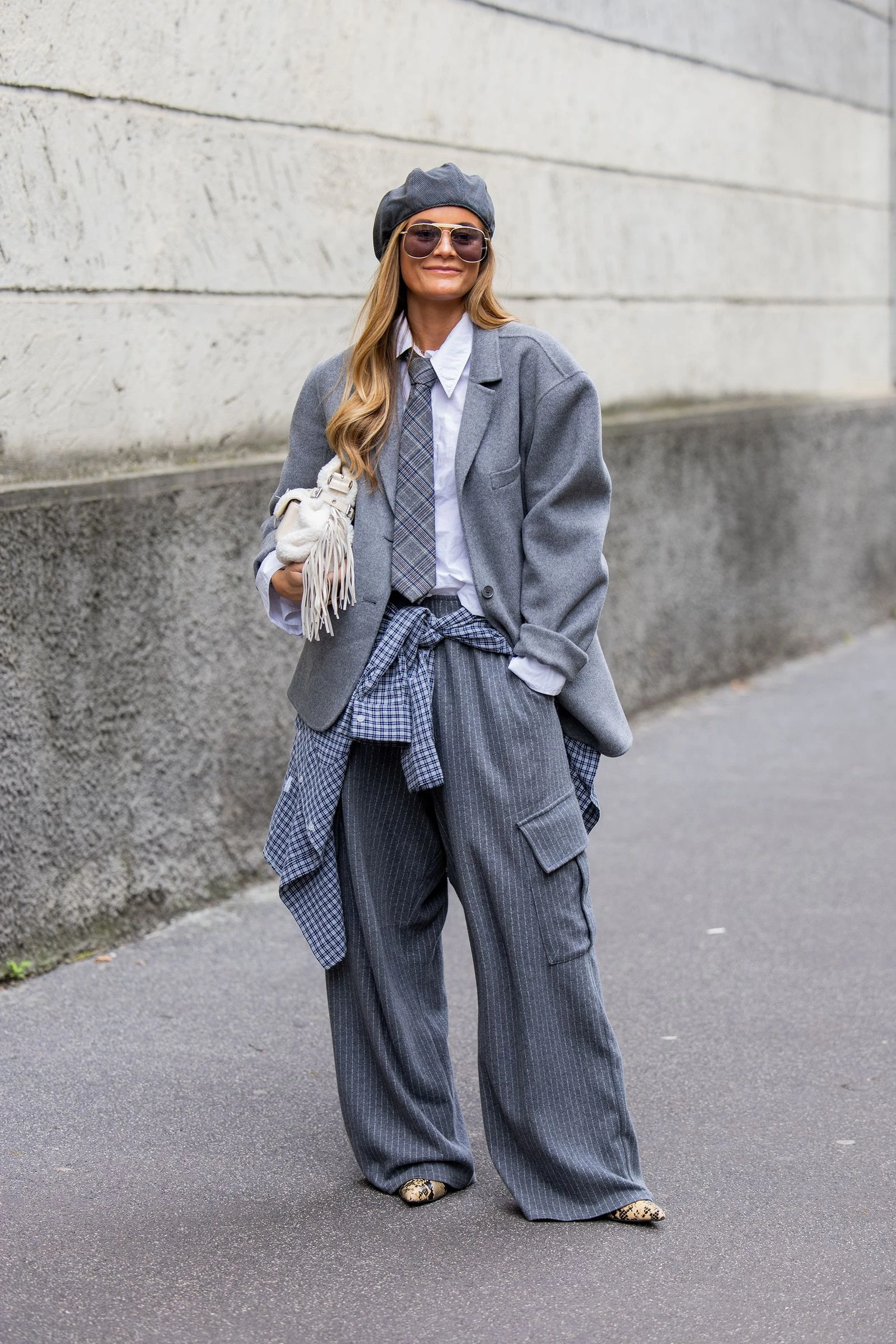 Карго перестають бути виключно "вихідним" варіантом: їх можна носити навіть у форматі ділових штанів у смужку. У лютому поєднання з принтованим взуттям особливо актуальне.