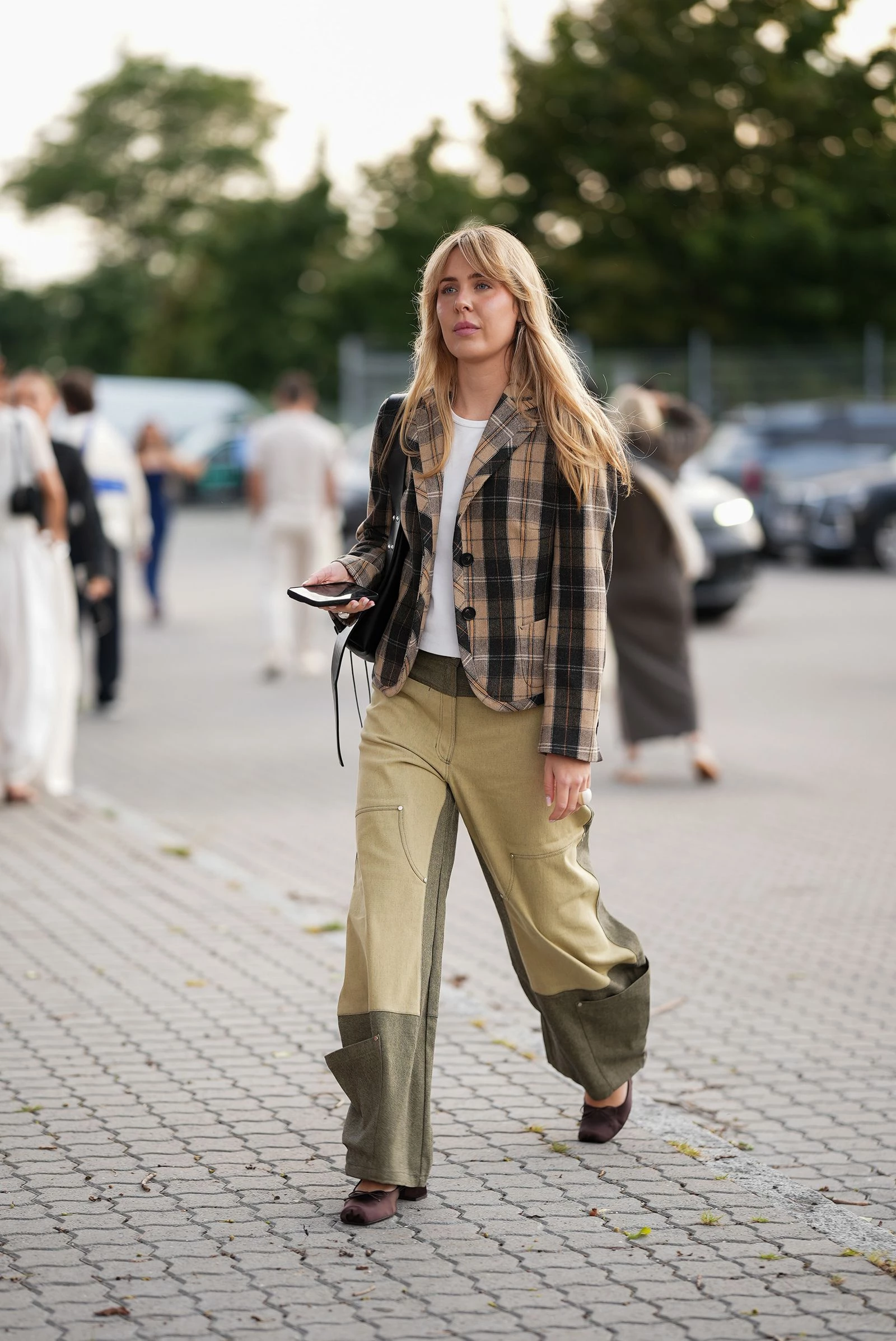 Штани карго в стилі color block — елегантна альтернатива джинсам: розслаблено, але завжди має добрий вигляд, особливо з атласними балетками на підборах і картатим жакетом.