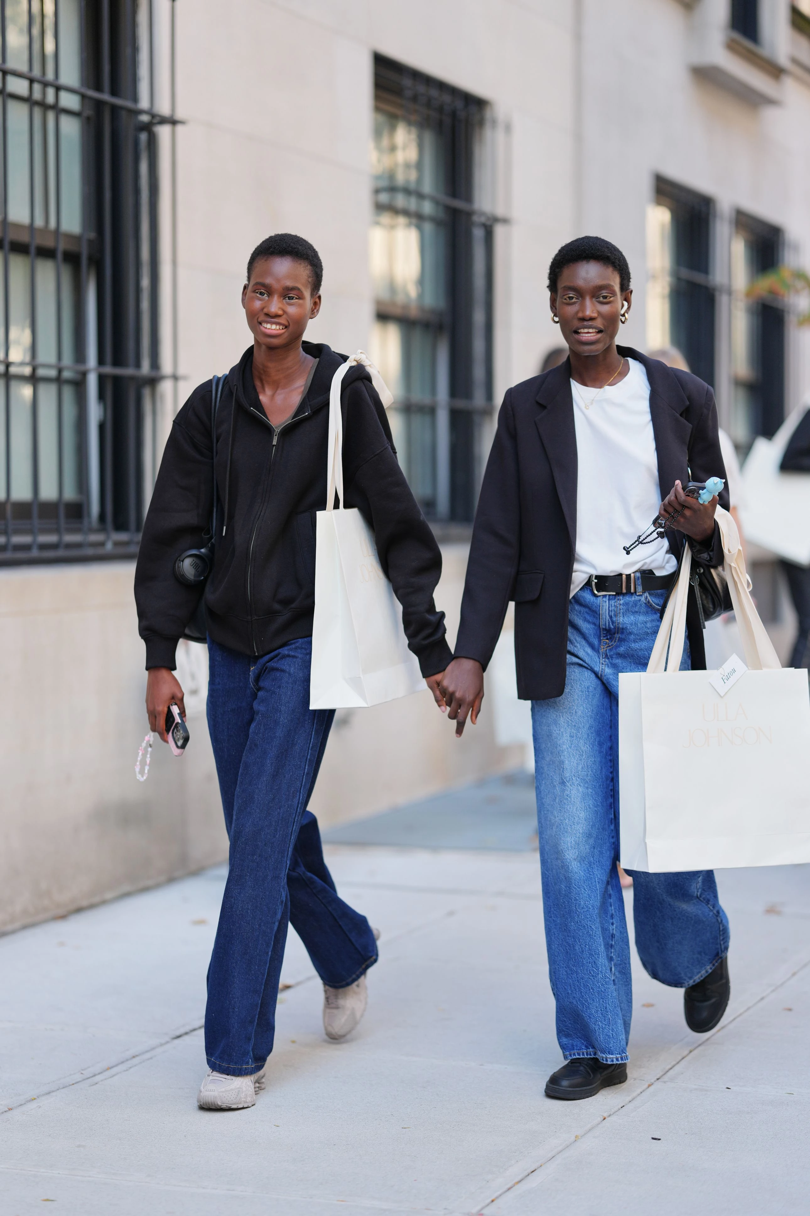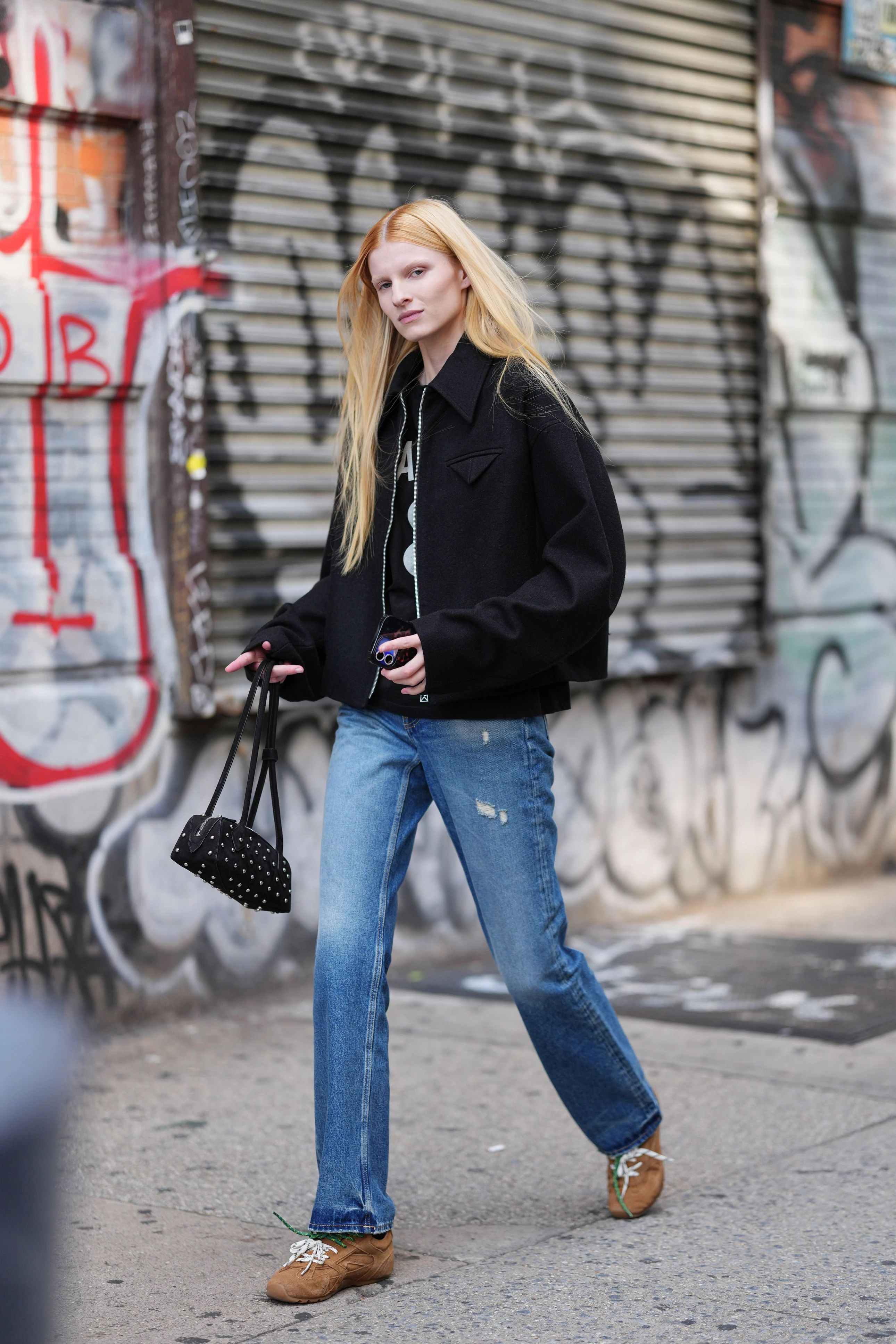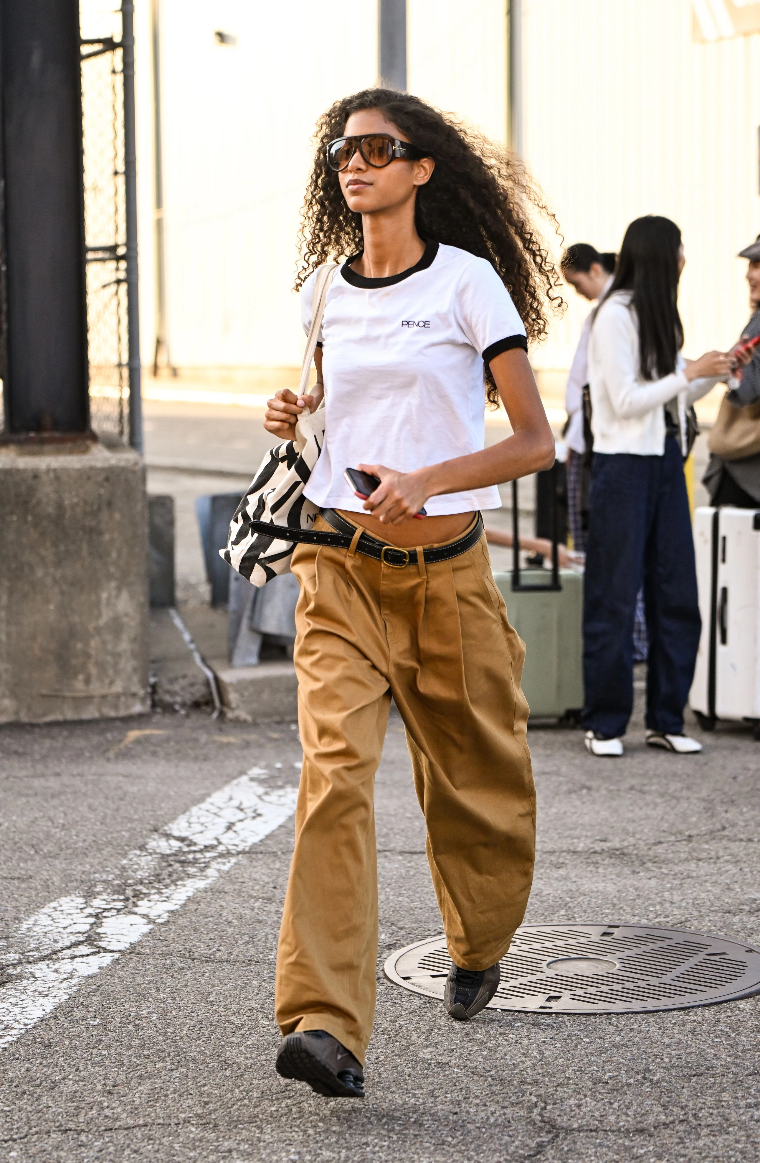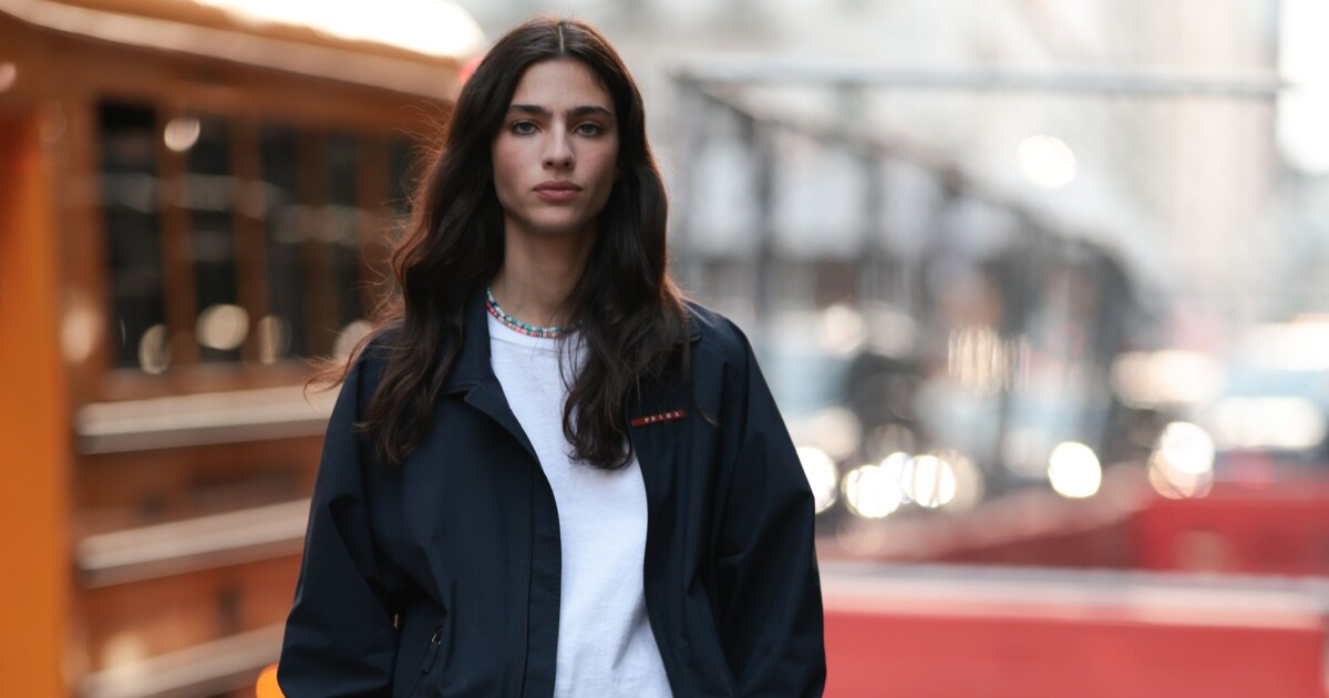Головні тренди не обійшлися без класики. Моделі масово обирали базові речі, які завжди актуальні у вуличній моді. Джинси та прості майки залишаються улюбленим вибором, але Лолі Бахія показала альтернативний підхід. Вона створила образ у стилі томбой: вільна біла футболка, широкі джинси, замшеві кросівки adidas і утилітарна куртка Prada.