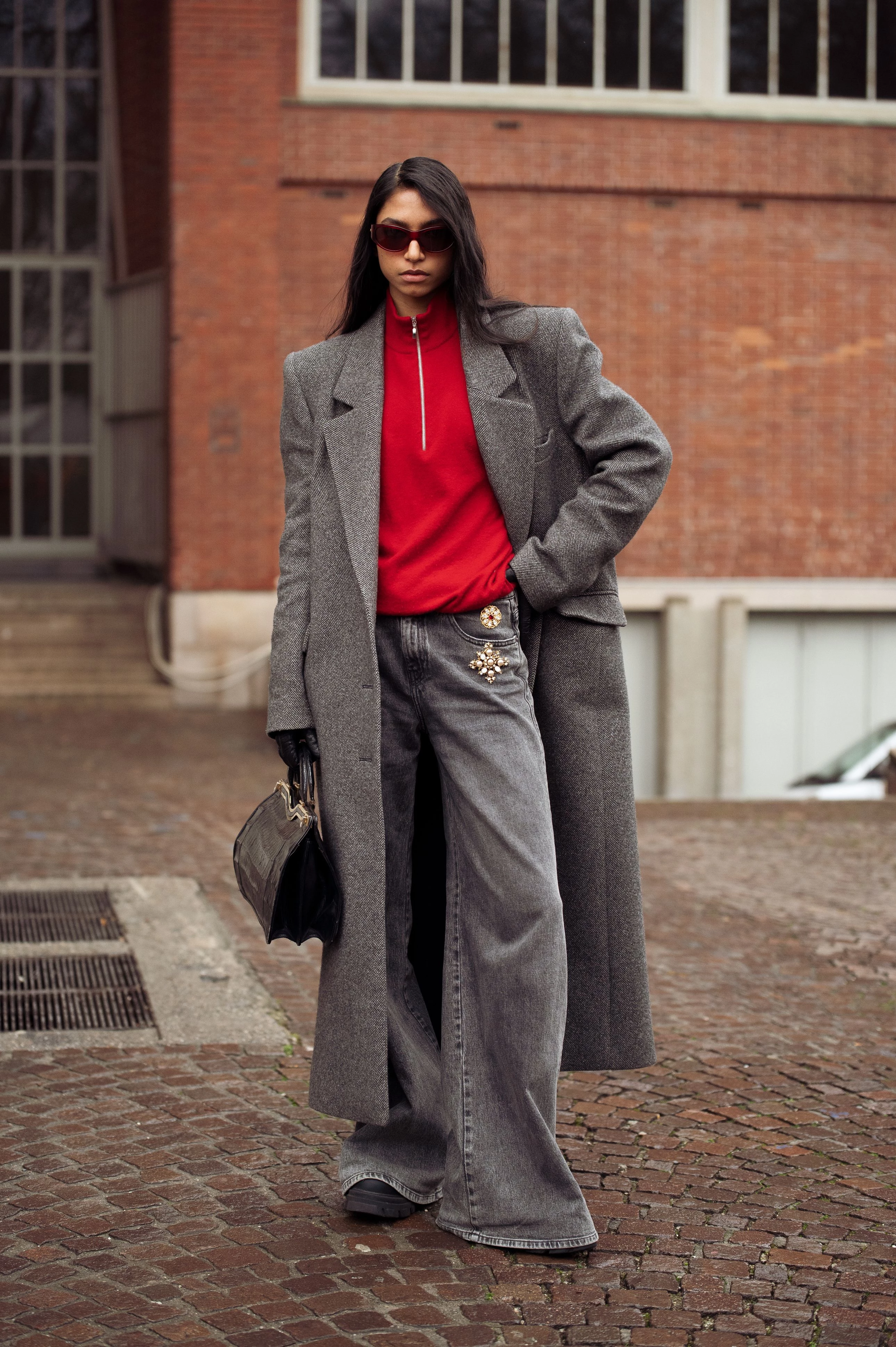 Іще один приклад яскравого контрасту: до холодних сірих тонів чудово пасує червоний, додаючи енергії стриманому образу. Цікавий вигляд має поєднання різних відтінків сірого з яскравими акцентами — наприклад, червоним пуловером, маскулінним пальтом та мішкуватими джинсами.