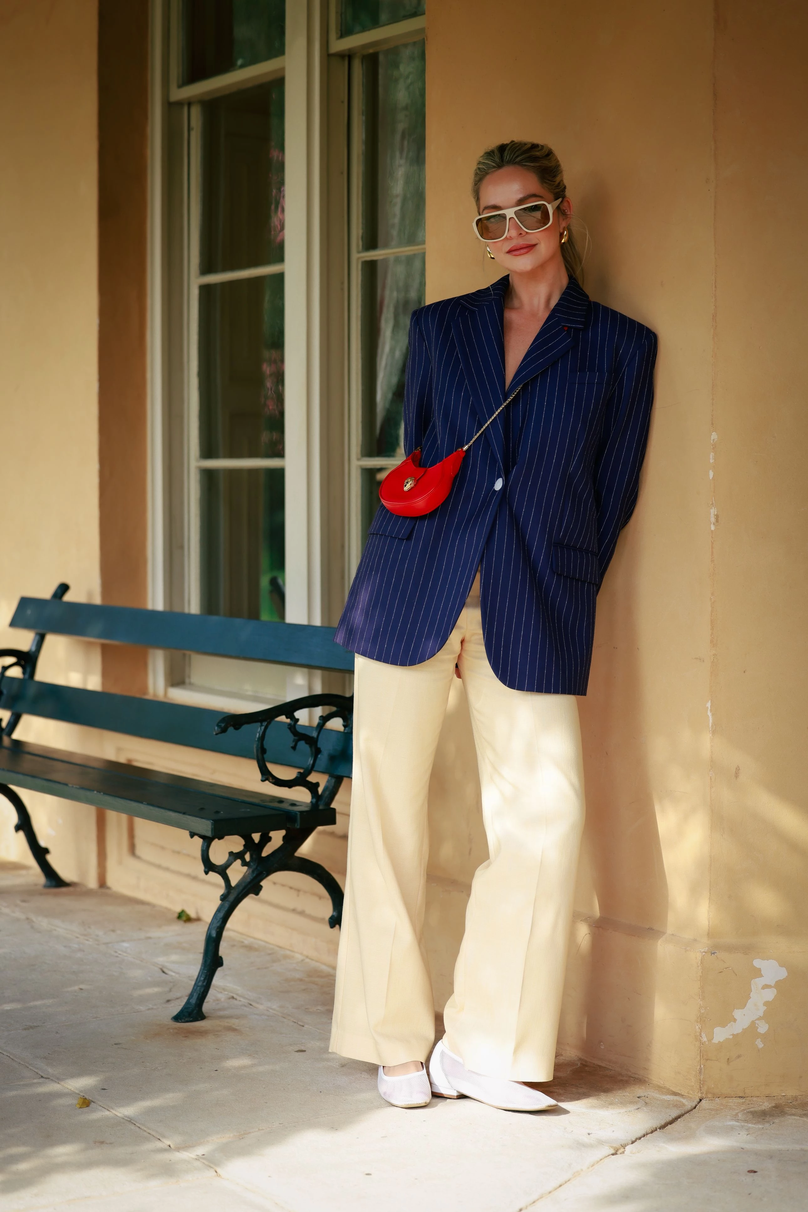 Темно-синій — класичний і стриманий, але в поєднанні з м’яким масляно-жовтим він набуває свіжості. Доповнити образ можна аксесуарами у спокійному сірому або ж у яскраво-червоному кольорі.