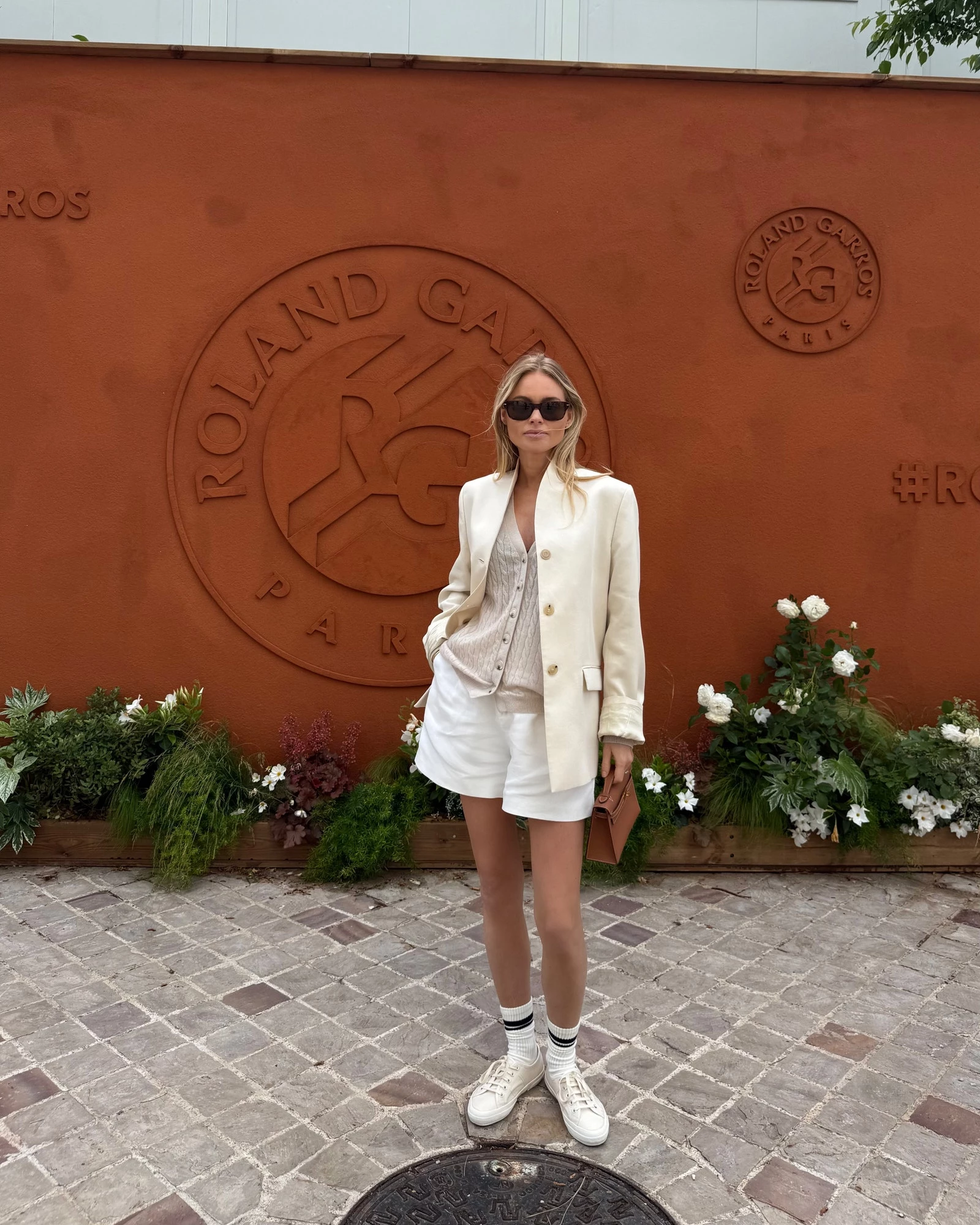 Цей образ переосмислює класичний тенісний стиль, поєднуючи елегантність і сучасність. Тканинні кросівки чудово поєднуються з елегантними шортами та тенісними шкарпетками в рубчик. Додайте лише лляний блейзер з м’яким силуетом, щоб завершити образ. Це вишукана інтерпретація естетики спортивного шику.