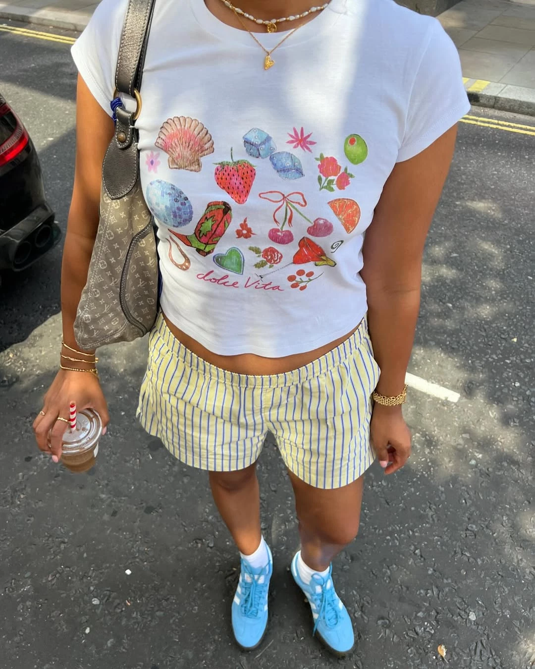 Піжамні шорти у смужку виходять за межі дому й стають must-have позицією цього літа. У парі з футболкою з принтом – це яскравий, іронічний образ. Блакитні кросівки adidas додають контрасту м’яким шортам, а пастельні тони та фруктові мотиви ідеально пасують для міста, відпочинку або неспішних літніх прогулянок.