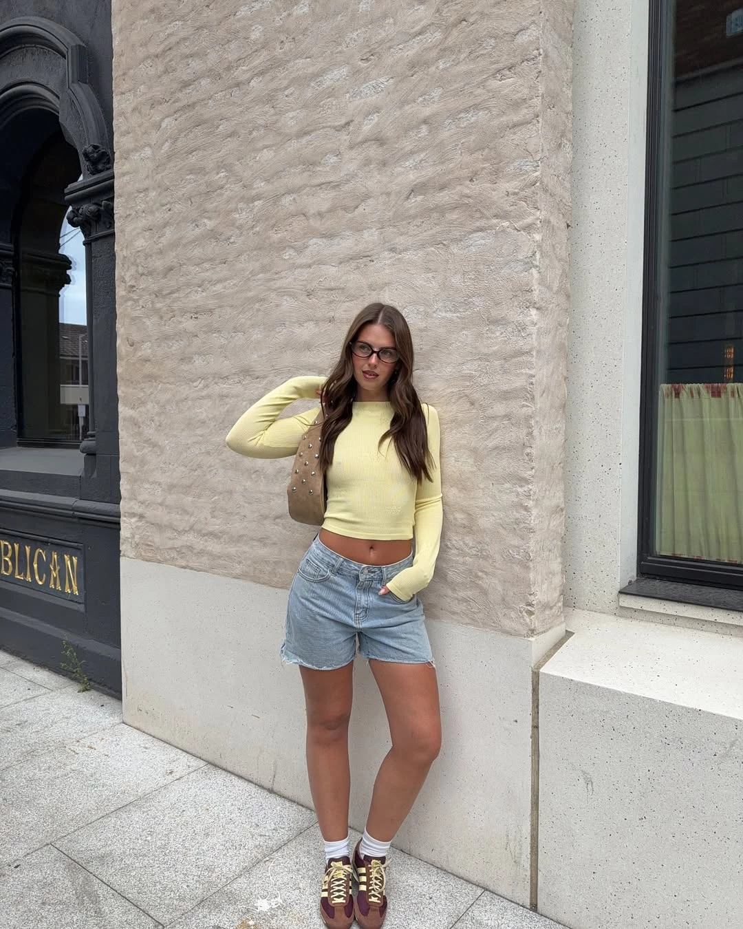 Вінтажні adidas SL 72 OG з потертістю + джинсові шорти з необробленим краєм – поєднання грубості та ностальгії. Лонгслів масляно-жовтого відтінку додає ніжності, а замшевий клатч із заклепками об’єднує бохо-атмосферу з панк-настроєм.