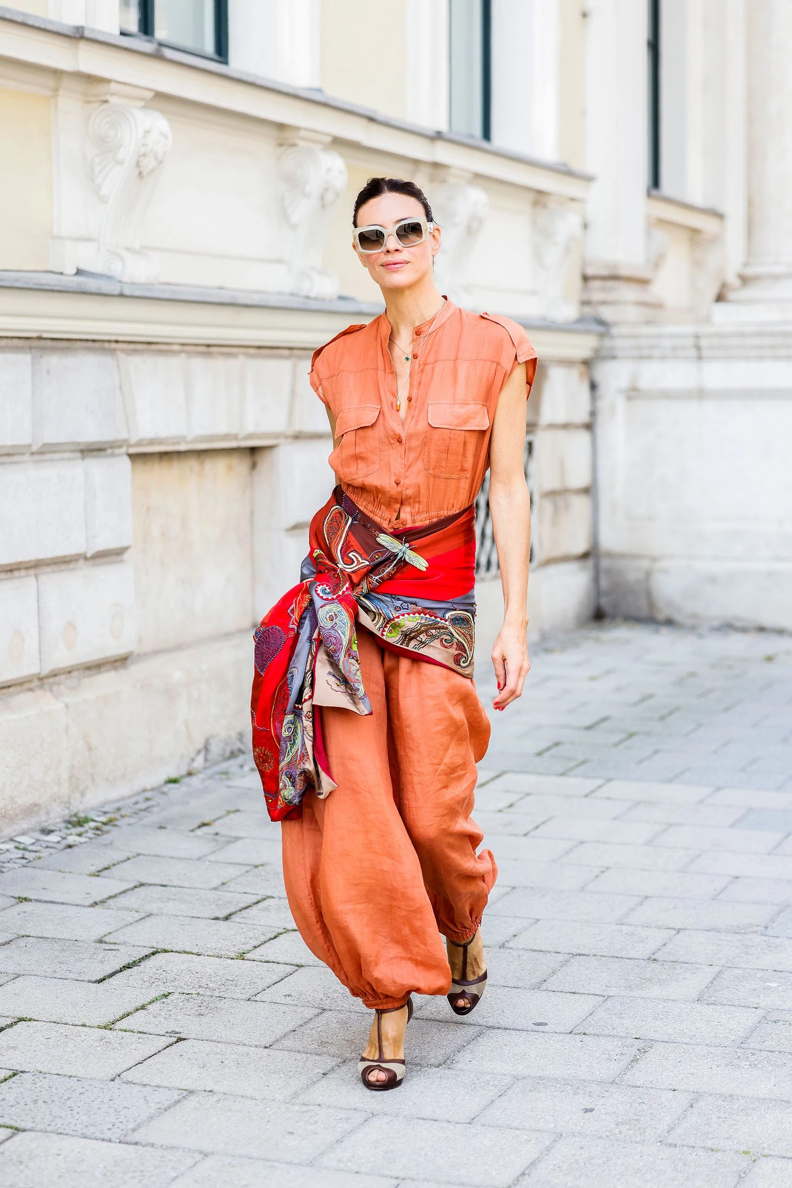 Якщо шаровари здаються надто "дикими" для вашого класичного стилю, поєднуйте їх із базовою сорочкою на ґудзиках. Такий верх "приручає" яскраву річ, надає їй офіційності та чудово пасує для офісу або ділової зустрічі. Додай пояс або шовкову хустку на талії, як це роблять streetstyle-зірки.