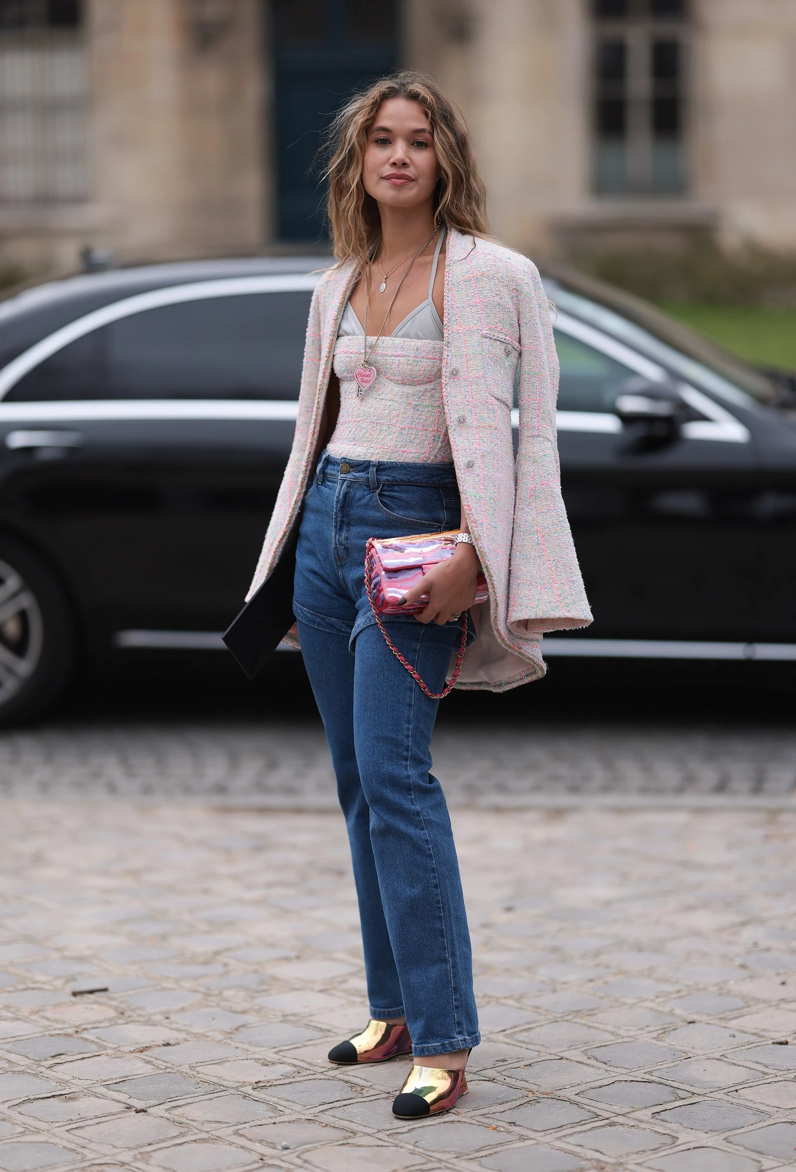 Взуття на танкетці з дзеркальним блиском, як у Chanel, — одна з головних тенденцій сезону весна-літо 2025. Воно додає розкоші навіть найпростішому образу. Модниці носять його у французькому стилі: із синіми вузькими джинсами, улюбленою блузою й твідовим блейзером. Радимо обирати пастельні тони — вони романтичніші.
