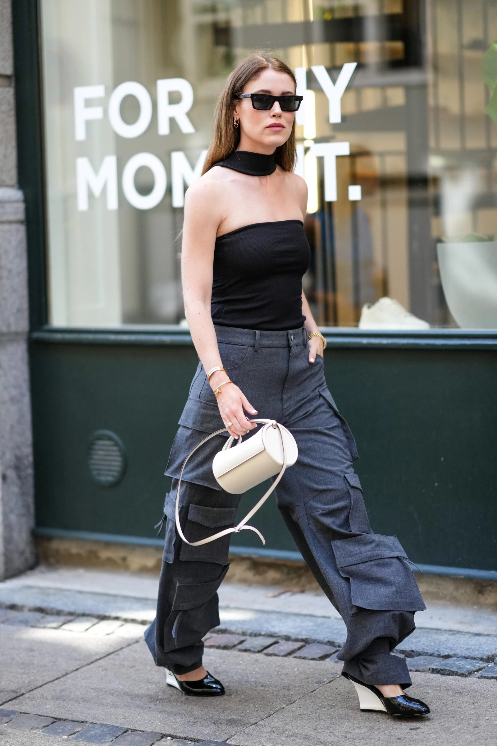 Туфлі на танкетці — головний вибір фанаток стилю Y2K. Chanel пропонують двоколірну модель із мигдалеподібним носком і ремінцем. Римуйте їх із мішкуватими штанами карго та топом-бандо.