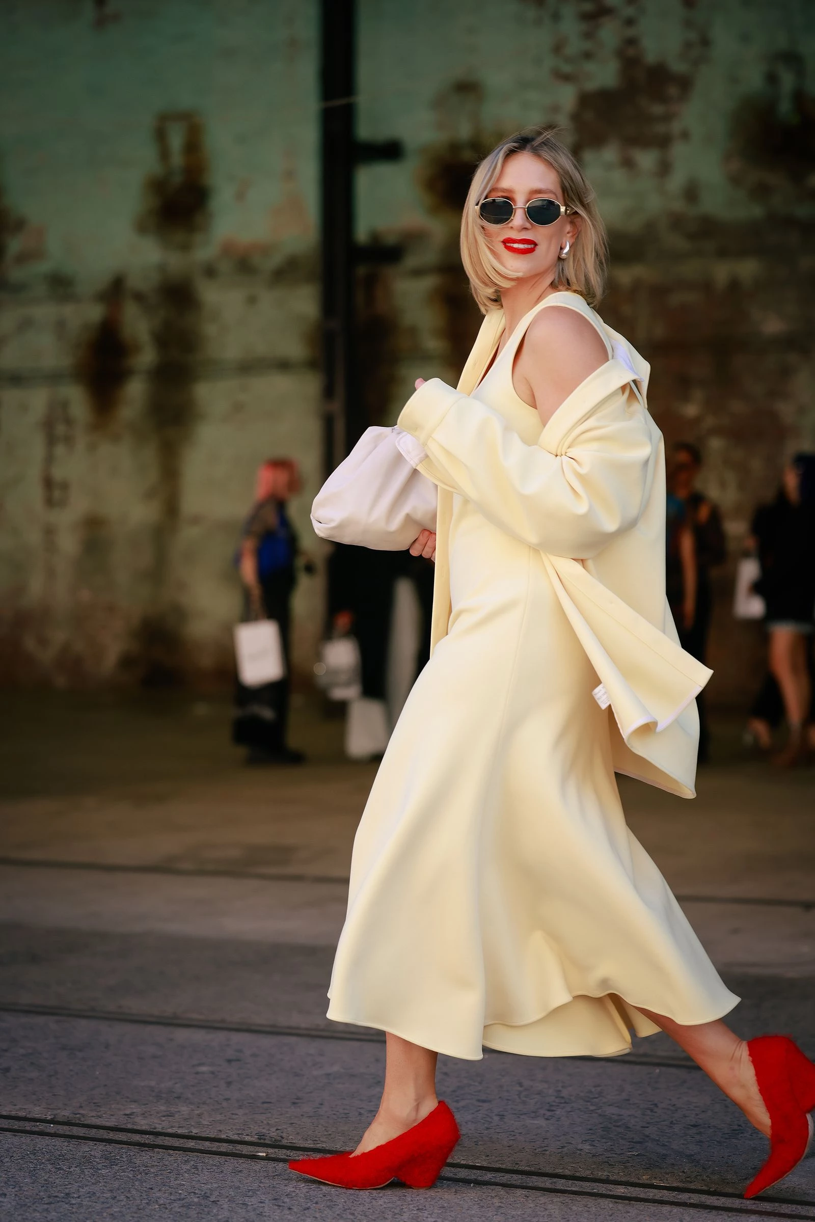 Найкраще для вересня – світлі нейтральні сукні на широких бретелях. На щодень їх можна носити з джинсовою курткою й балетками, а для особливої нагоди – додати оверсайз-сорочку і яскраві туфлі на танкетці, наприклад, червоні чи бордові.
