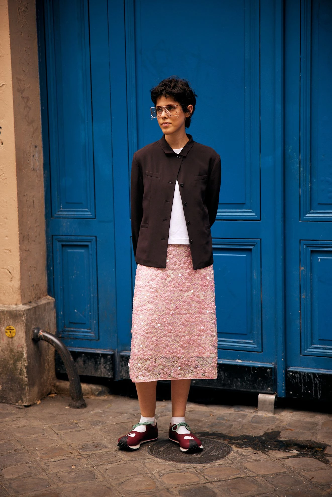 Цього сезону обирайте стриману мідіспідницю, білу футболку, структурований жакет і трендові балеткроси. Ідеально для тих, хто балансує між елегантністю та комфортом.