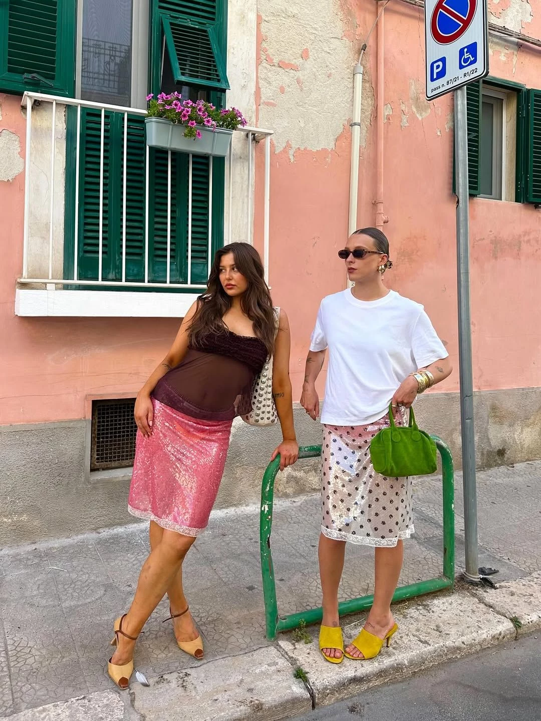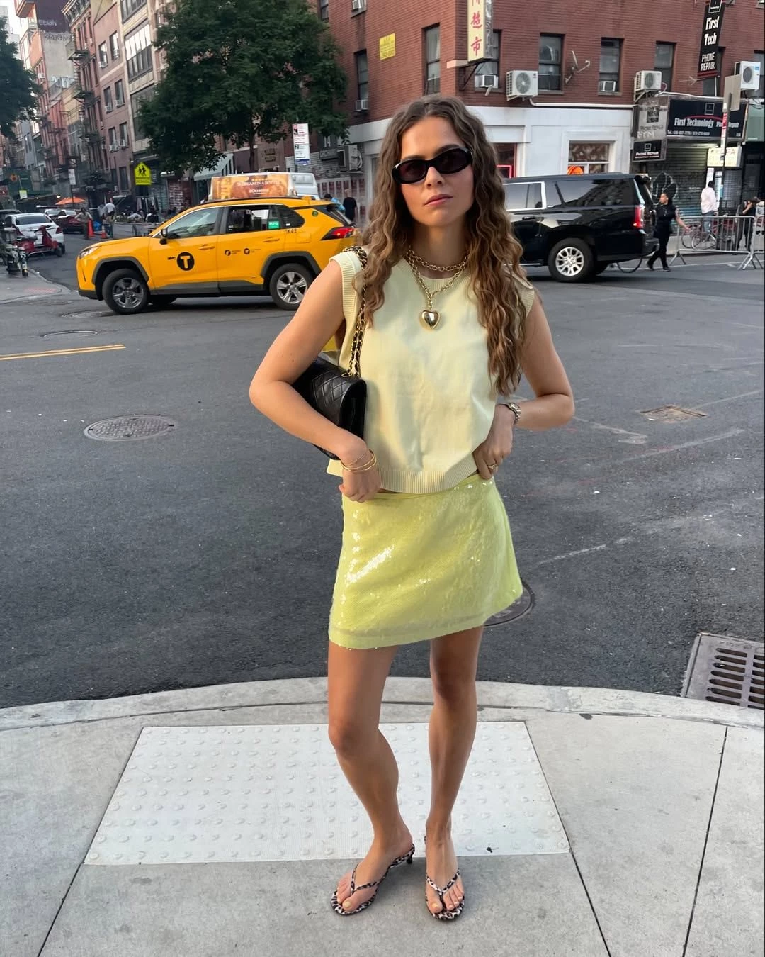 Цей образ найкраще доводить, що блискуча спідниця – не лише для вечора. Цього літа обирайте модель довжини міні в парі з топом у тон і вʼєтнамками на підборах з анімалістичним принтом. Завершіть образ масивним підвіском у формі серця.