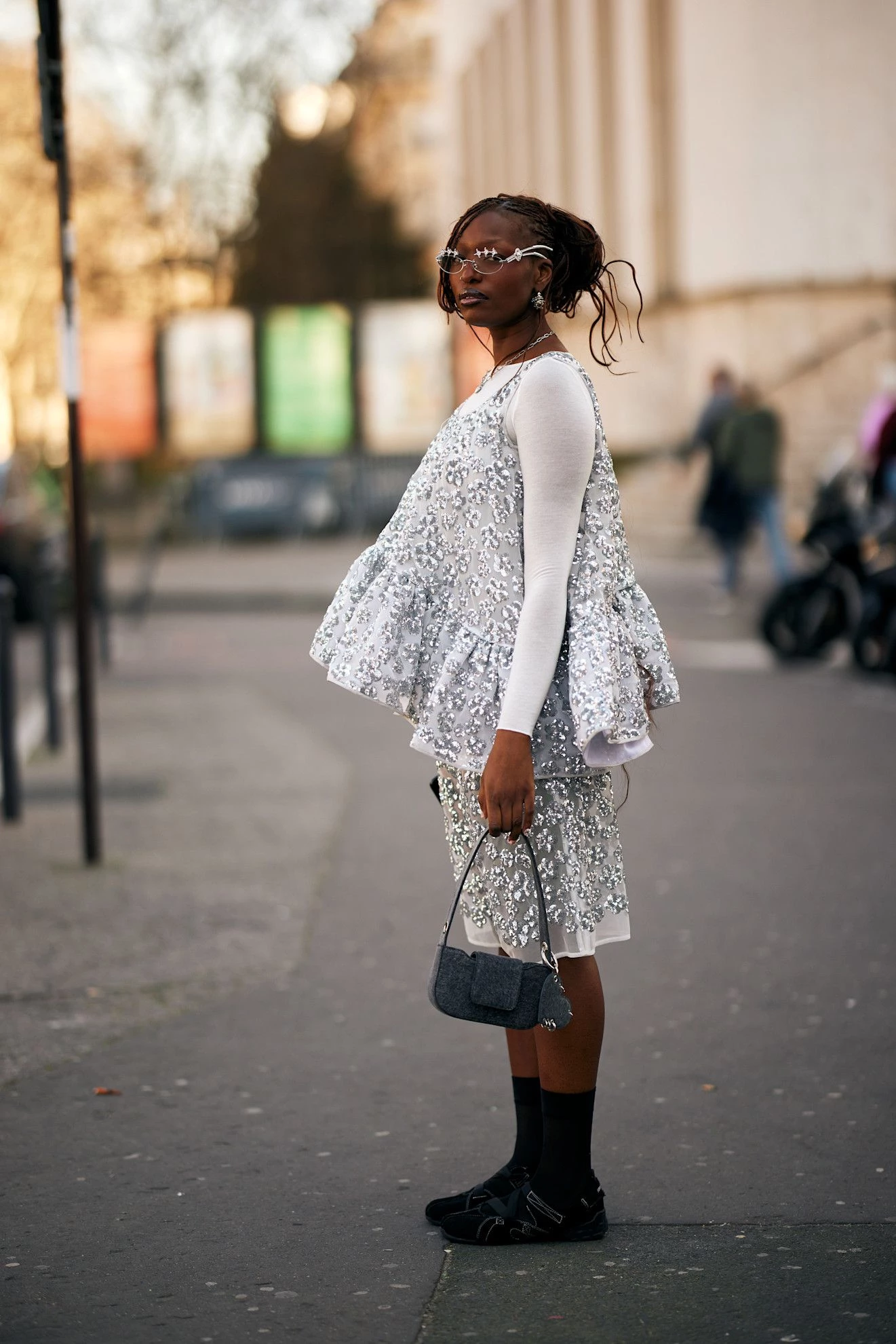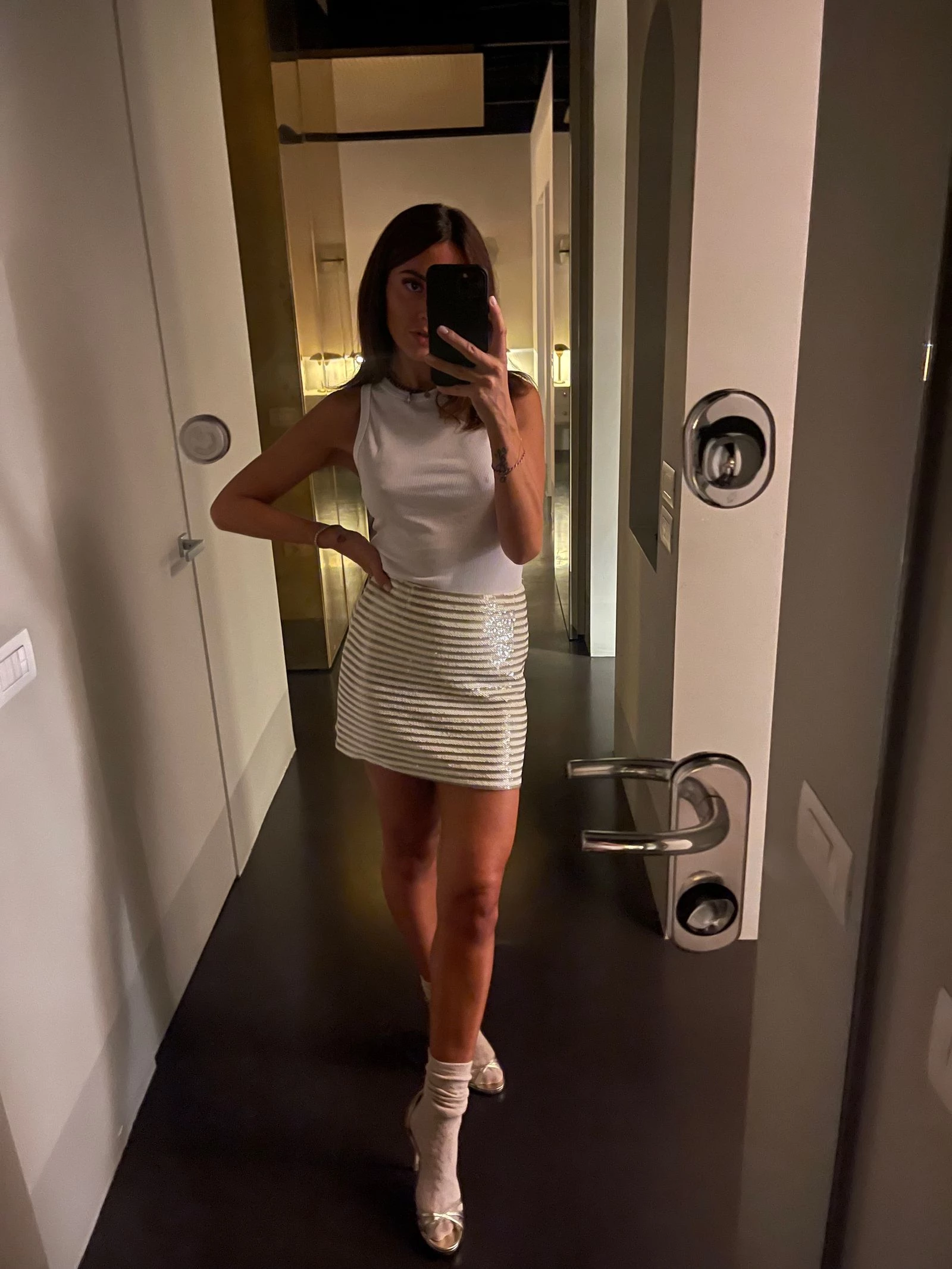 Прихильницям спортивного шику варто звернути увагу на поєднання блискучої мініспідниці з простою білою майкою, яка врівноважує загальну експресію. Босоніжки на підборах додають елегантності, а високі шкарпетки – грайливості.