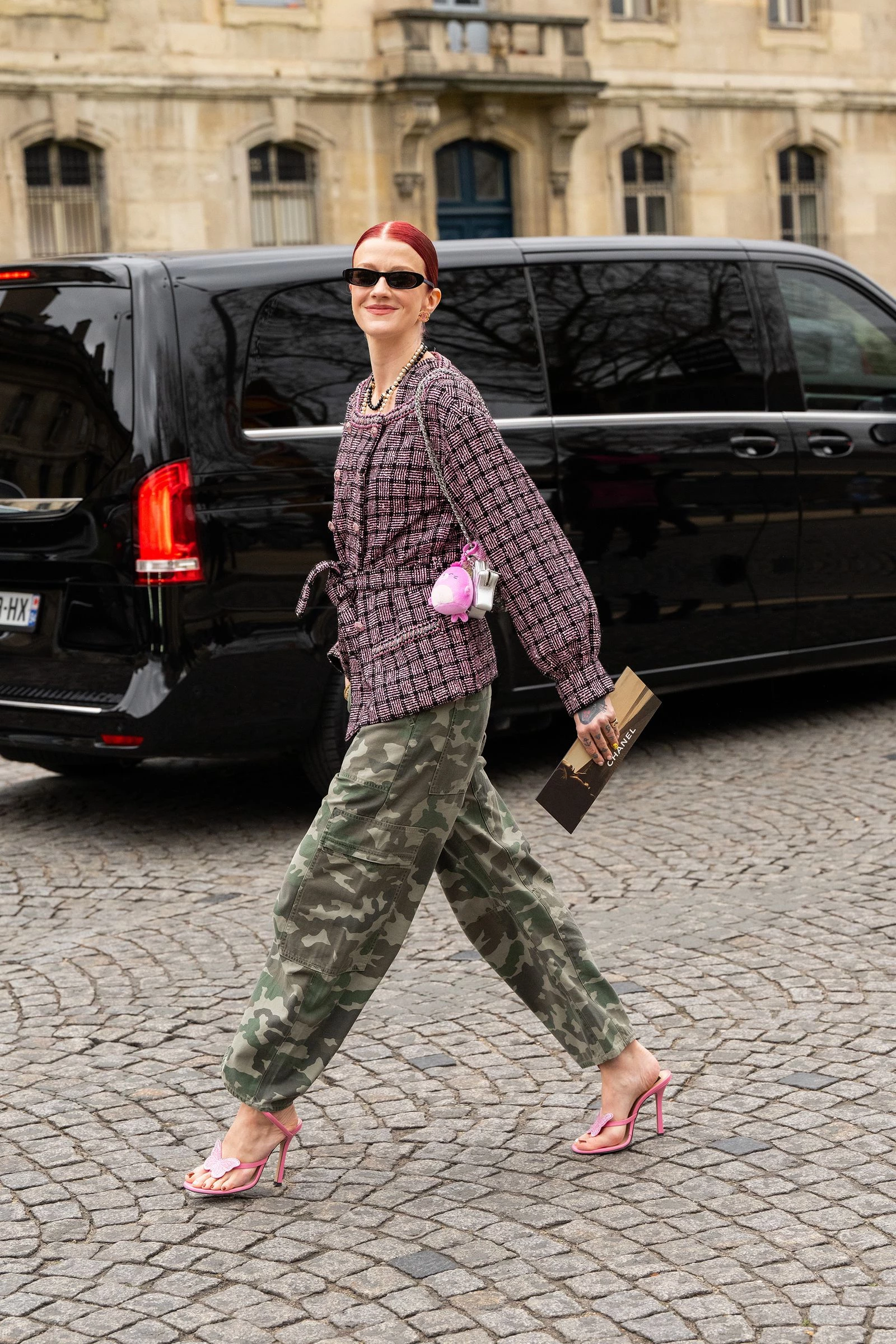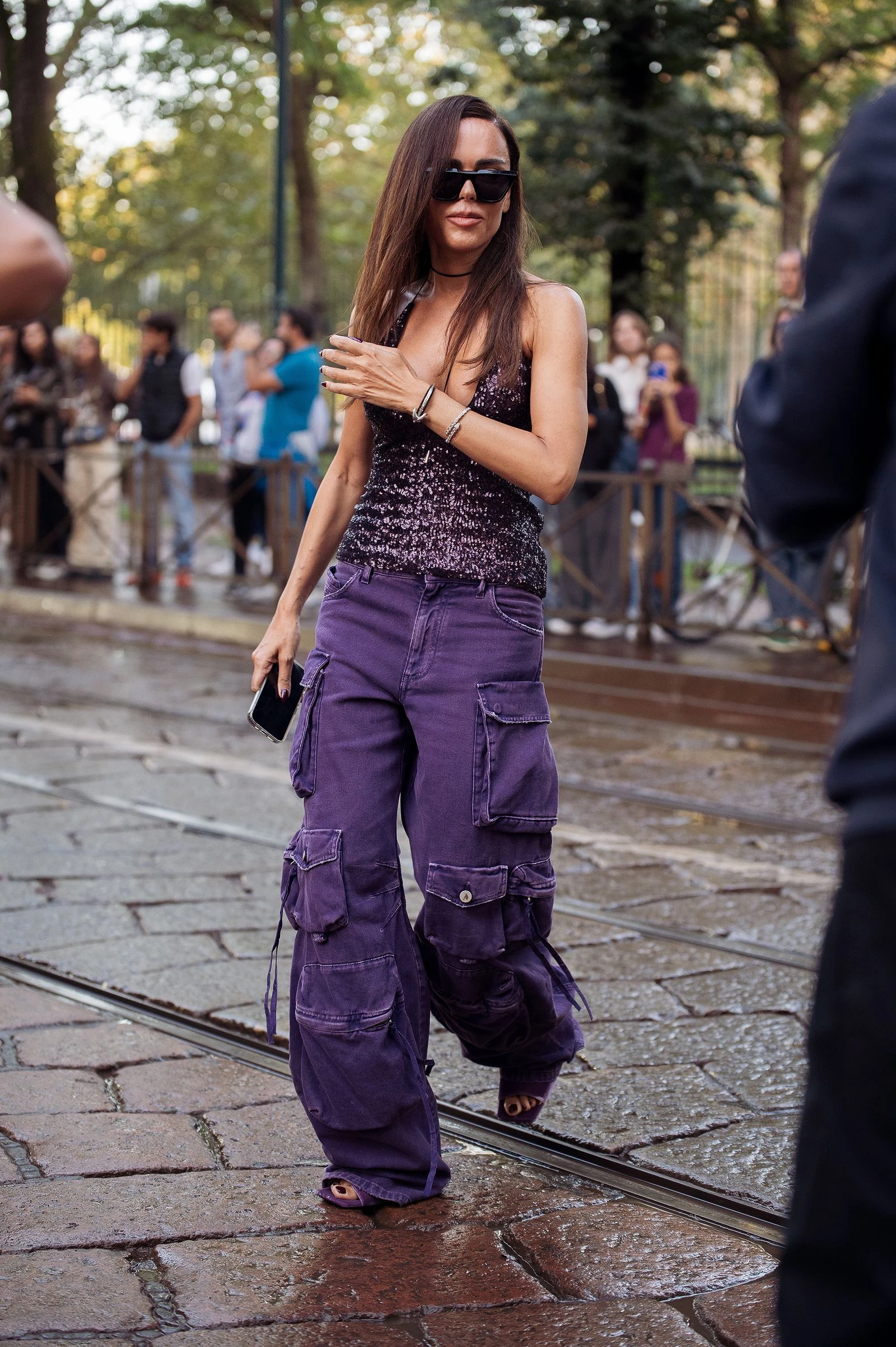 Мюлі в яскравих відтінках — ще один варіант, який ідеально поєднується з модними карго-штанами у 2025 році. Латиноамериканські співачки, зокрема Талія, Шакіра й Пауліна Рубіо, ще у 2000-х створили безліч знакових образів із таким поєднанням. Найактуальніші кольори — фуксія, лаймово-зелений, електрик, помаранчевий і металік. Таке взуття чудово доповнює мішкуваті карго-джинси та додає настрою навіть найпростішому вбранню. Надихайтеся колекціями Diesel і Blumarine або зверніть увагу на стрітстайл із Нью-Йорка та Парижа — цей образ активно повертається у моду.