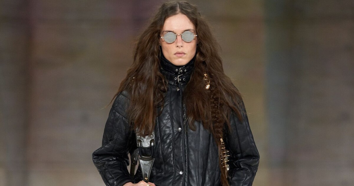 У Chloé Чемена Камалі, чию роботу зазвичай асоціюють з білими бохо-сукнями, залишилася вірною своєму підходу, але цього разу додала до колекції об’ємну синю картату спідницю. Її поєднали із застібнутою на блискавку чорною шкіряною курткою. Саме контраст легкої тканини й щільної шкіри зробив цей образ особливо сильним.