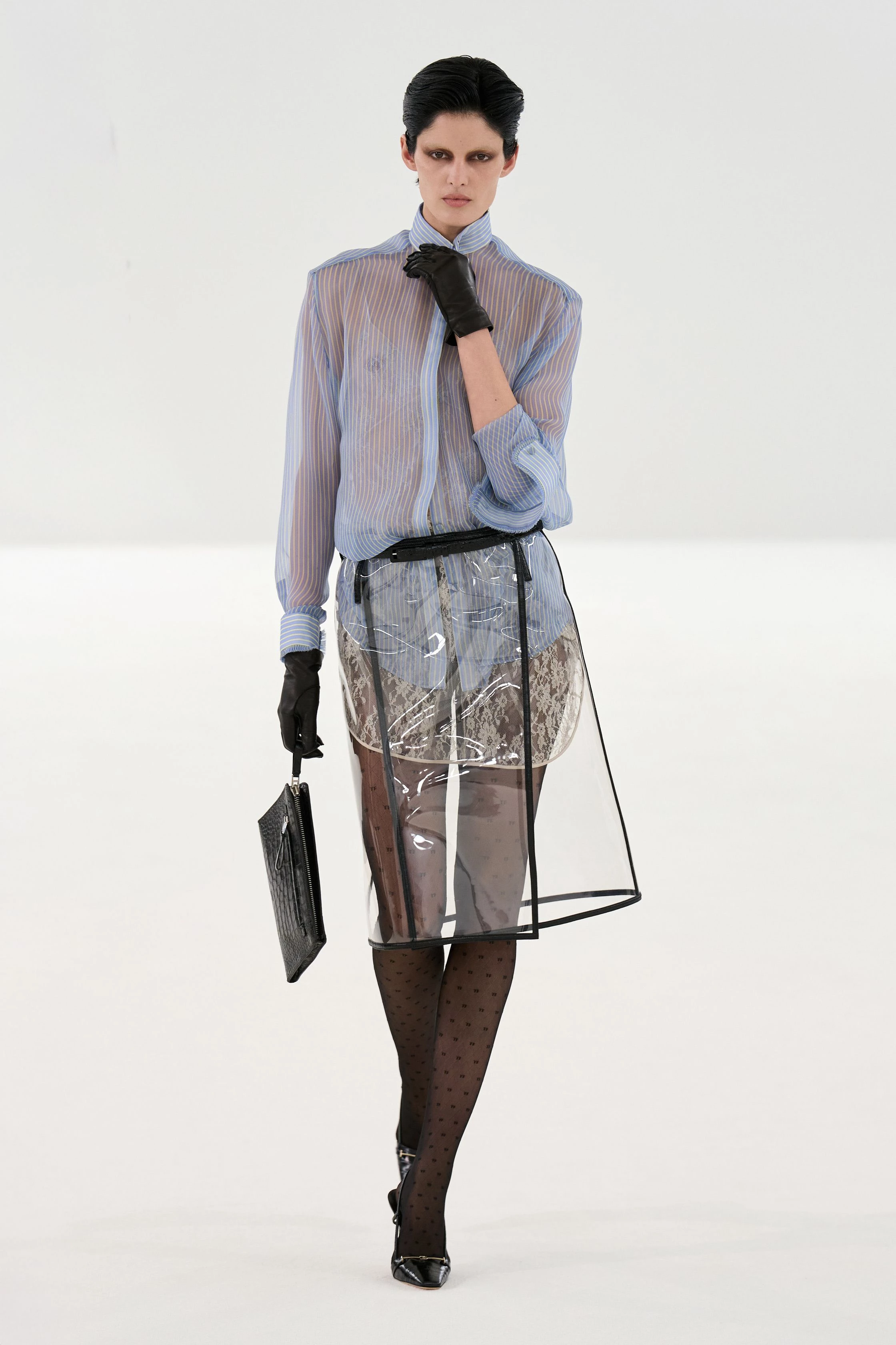 Згодом з’явилася серія образів із прозорого пластику: укорочений блейзер, тренч і навіть хустка. Лише Акерманн здатен перетворити матеріал, який асоціюється з дитячими дощовиками, на інструмент модної провокації. Під А-силуетними спідницями з цього матеріалу чітко проглядалися мереживна білизна і панчохи з логотипом TF.