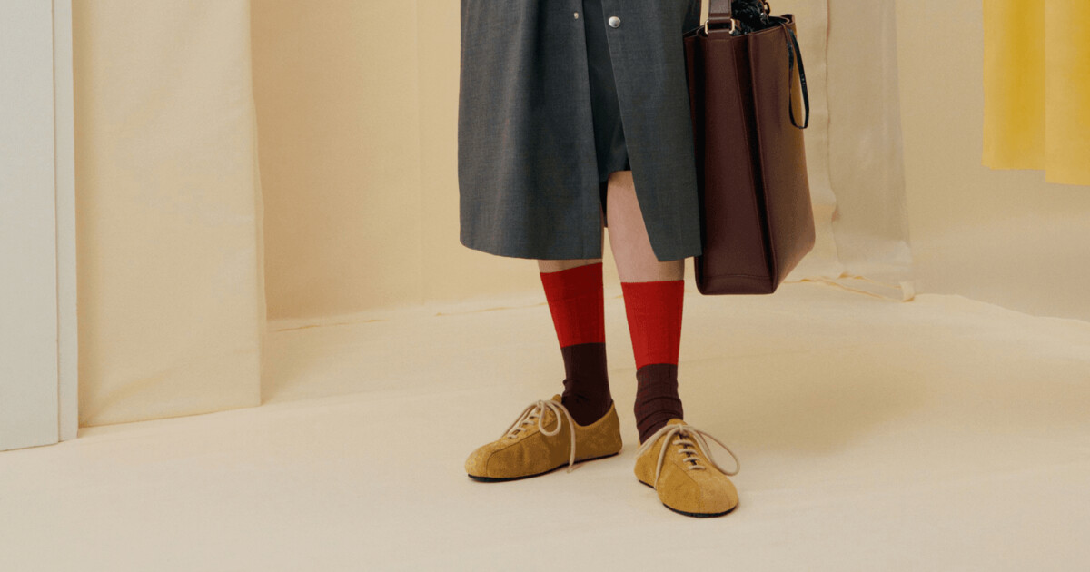 Пласка підошва + яскраві шкарпетки = виклик правилам. Miu Miu роблять з цього маніфест, демонструючи свободу від канонів краси. Джіджі Гадід показала, як носити цей дует із пальтом з яскраво вираженими плечима в стилізації no pants – грайливо та стильно водночас.