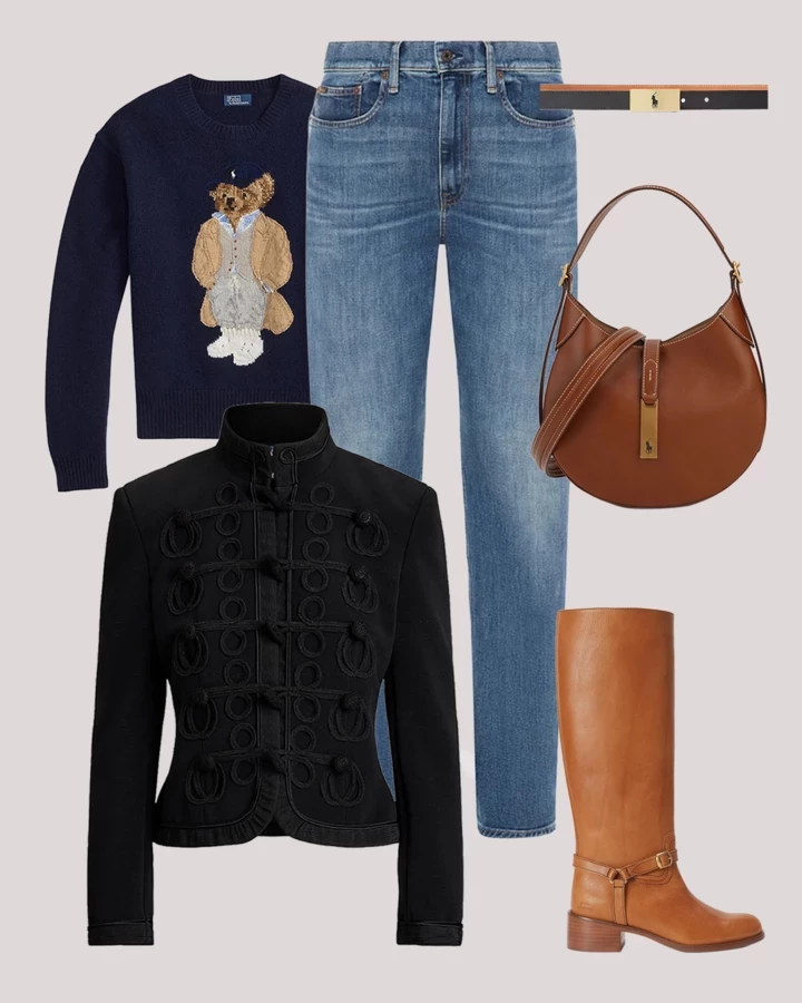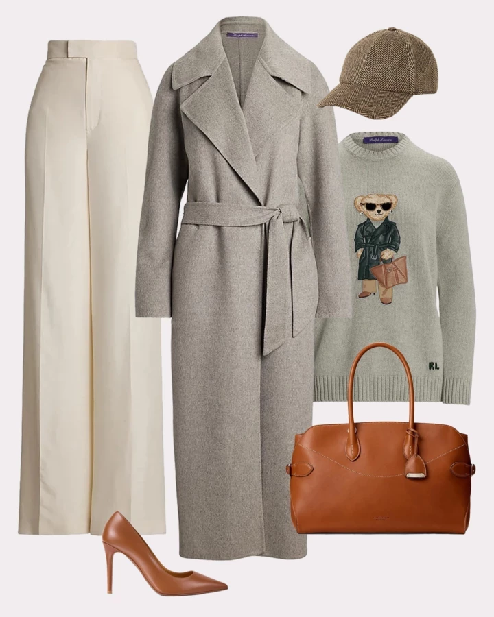 Якщо цього року вам ближча розслаблена, але бездоганно елегантна стилізація, зверніть увагу на культовий трикотаж Ralph Lauren Collection. Джемпер із фірмовим ведмедем поєднайте з шовковими штанами, а коричневі аксесуари — взуття, ремінь і сумку — підберіть у тон мотивам светра, вибудовуючи цілісний і продуманий образ.