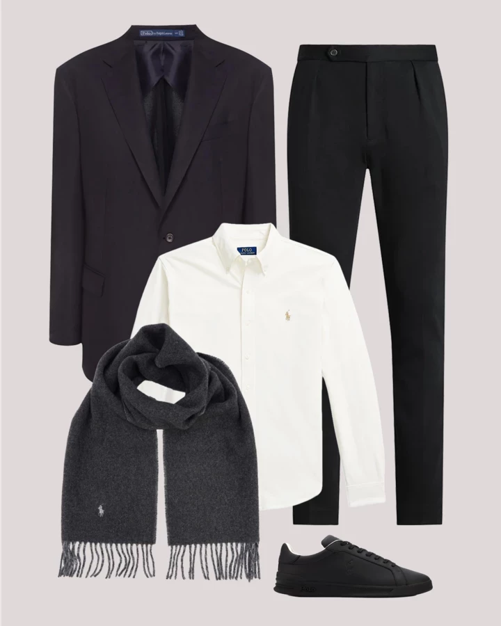 Чорний костюм із білою сорочкою — беззаперечна класика чоловічого гардероба. Розслабити офіційний вигляд допоможе шарф із торочками, що спадатиме з плечей, додаючи образу легкості та стилю.