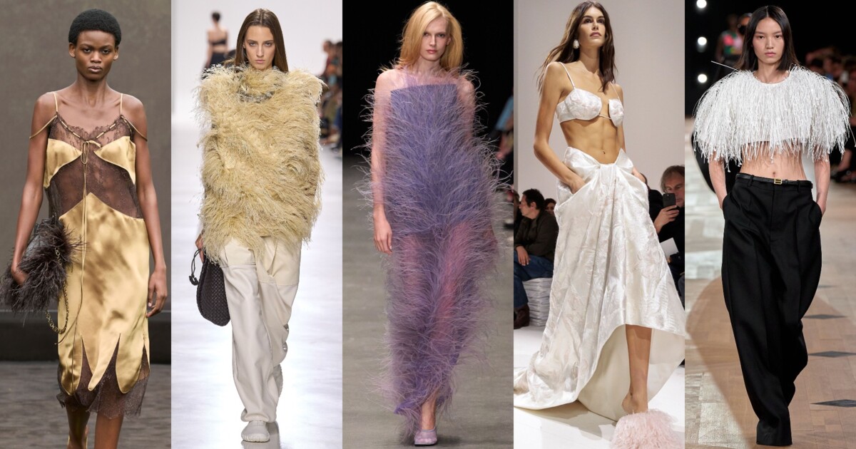 Пір’я обрамляє вирізи та рукави, прикрашає подоли, роблячи найпростіші сукні миттєво ефектними. Воно рухається разом із тілом, підкреслює форму та додає драматичності. На подіумах можна було побачити як "пухнастий" total look від Stella McCartney, так і сміливі рішення The Attico та більш лаконічну версію Balenciaga. Мінісукні з пір’ям ідеальні для вечірок, а повністю пір’яні моделі створені для особливих випадків.