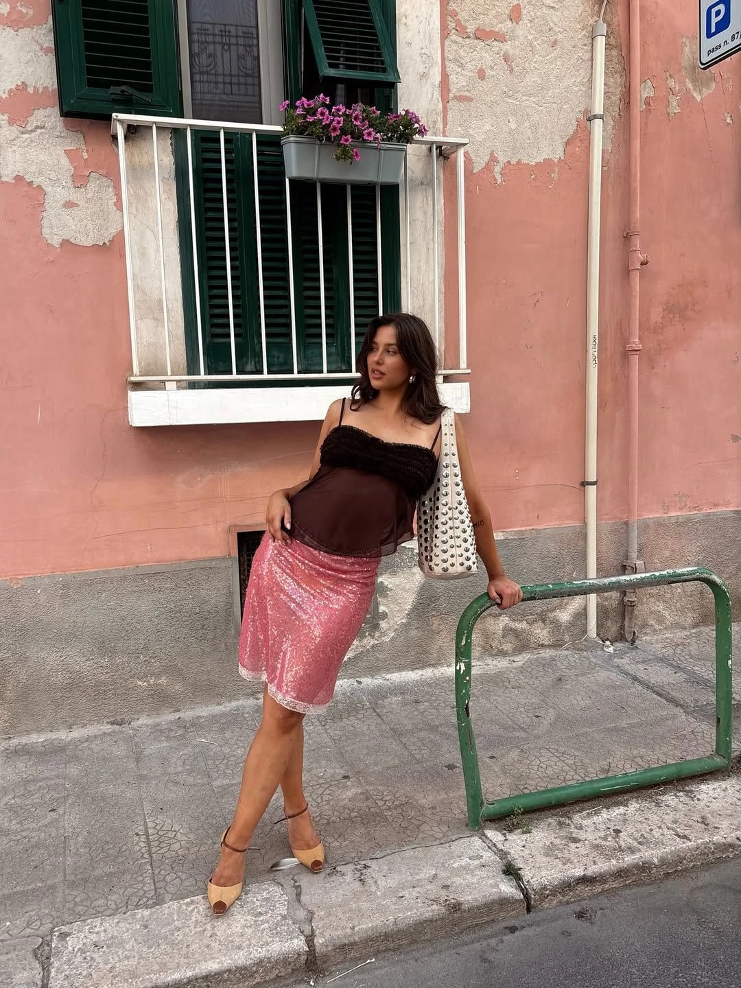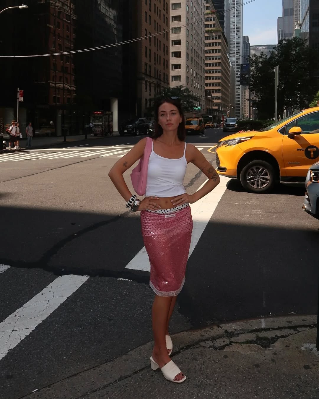 Рожева спідниця з лелітками — не просто акцентна річ, а справжній літній mood booster. Щоб зберегти баланс, поєднуйте її з базовими речами: білою майкою на тонких бретелях, лаконічним топом чи улюбленою сорочкою. У денному варіанті додайте балетки або босоніжки, а ввечері — мінімалістичні підбори й масивні сережки. Щоб образ не виглядав надто святково, тримайтеся простих ліній, натурального макіяжу й зачісок без зайвої графіки. Цього літа блиск — не для вечірок, а для щоденних пригод.