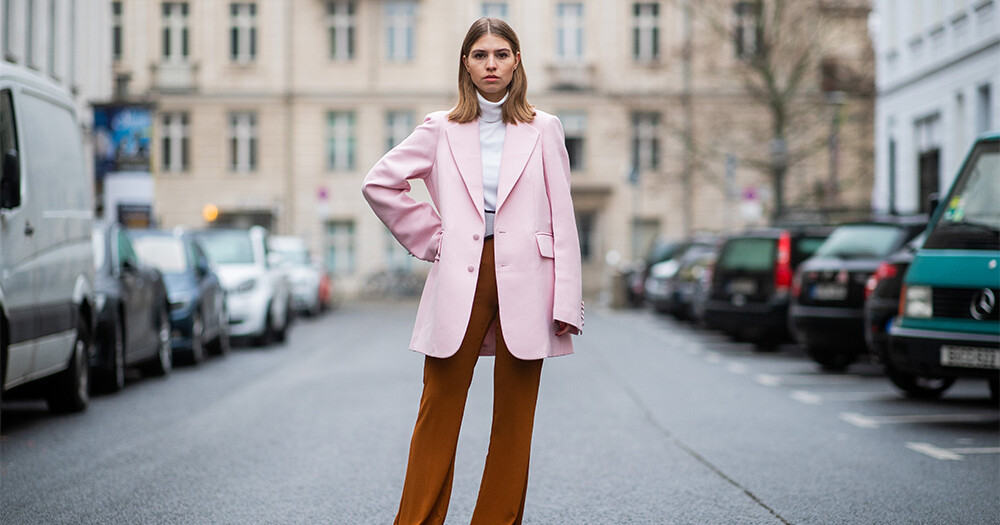Oversize-моделі рожевих жакетів чудово поєднуються з коричневими штанами з високою посадкою. Інфлюенсерка Свантє Зомер демонструє, як ефектно римувати ніжно-рожевий блейзер з легкими світло-коричневими штанами та білою водолазкою, що врівноважує всю колірну палітру образу.