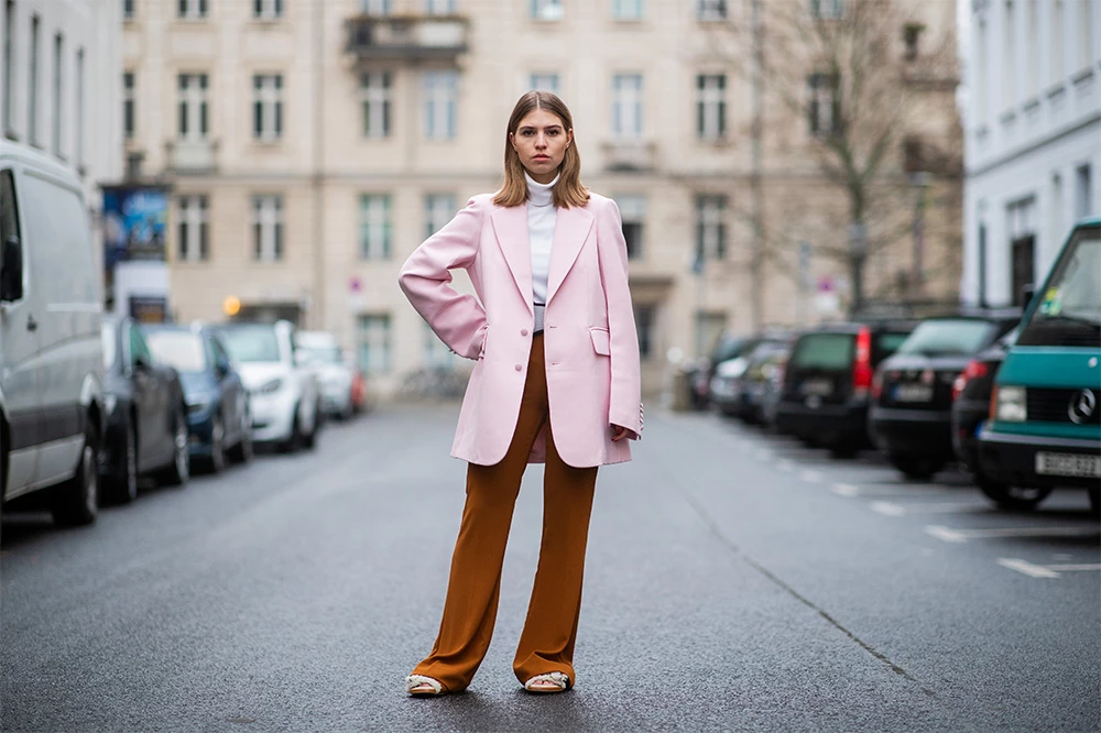 Рожевий жакет + коричневі штани — стильне поєднання цього сезону
