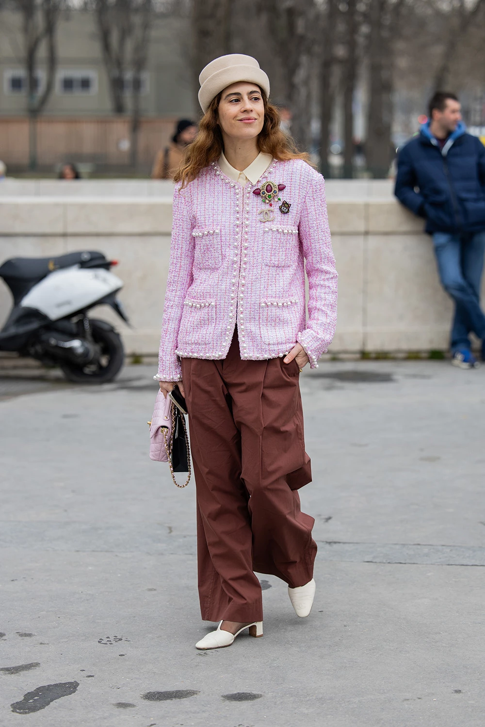 Найстильніший дует цієї осені – рожевий жакет у поєднанні з коричневими штанами різних фасонів і матеріалів. Радимо звернути особливу увагу на твідовий блейзер з перлинними деталями та класичні коричневі штани – комбінацію, яка вже стала фаворитом мешканок Копенгагена.
