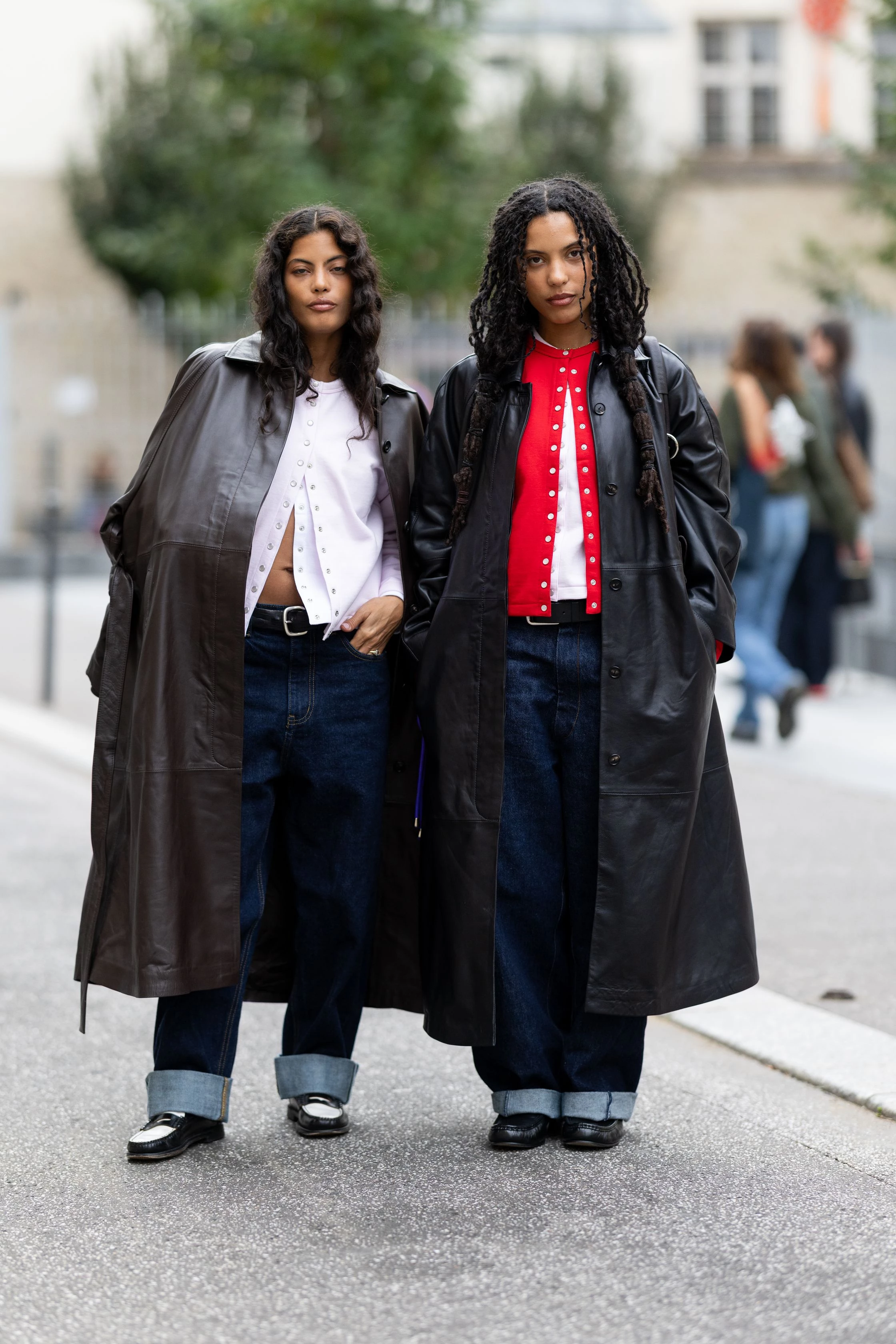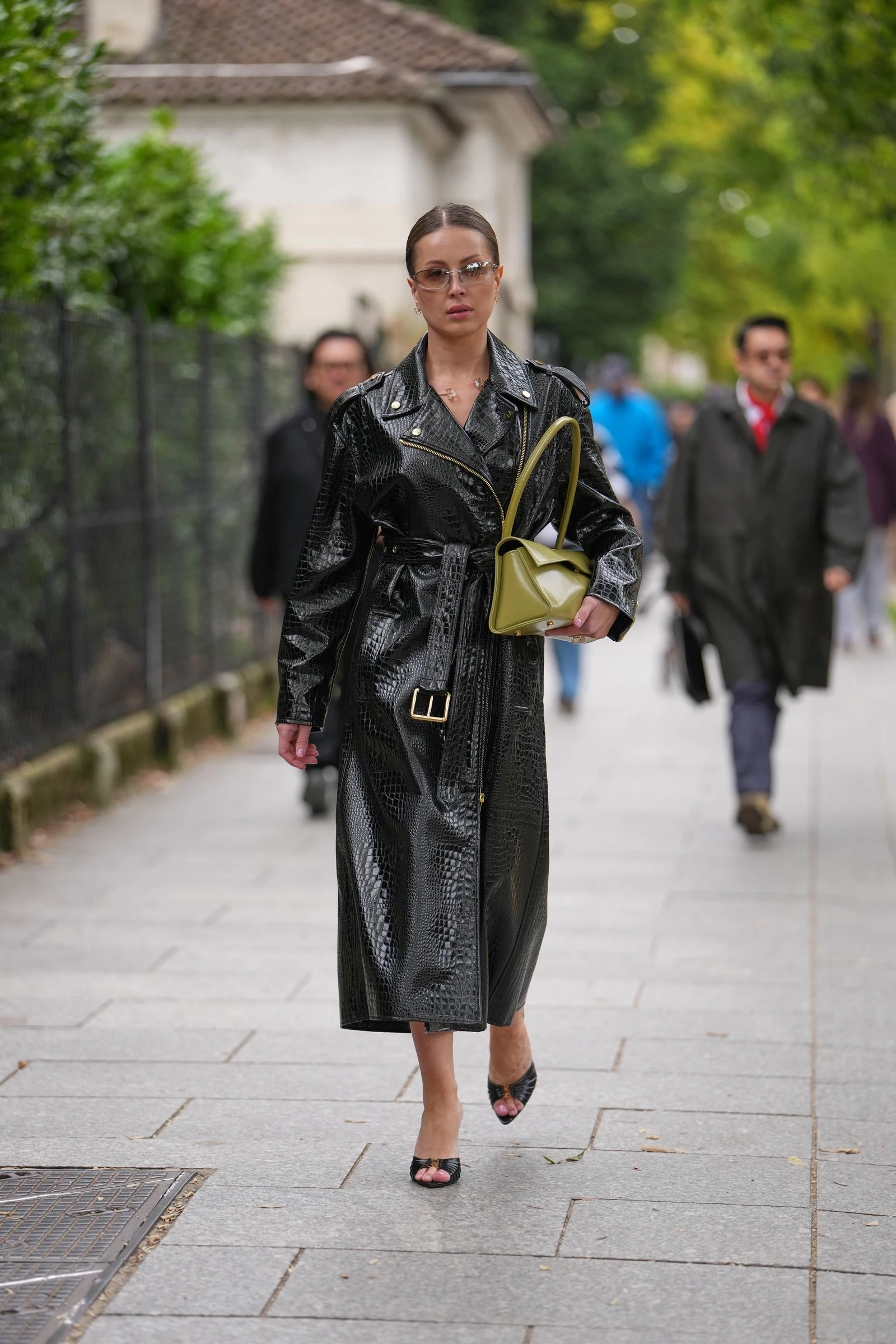 Під час Тижня моди в Парижі шкіряний тренч став однією з найпомітніших речей у стрітстайл-образах. Парижанки традиційно залишаються відданими формулі — функціональність, витонченість і жодних надмірностей. Тож цього сезону їхню прихильність здобула саме шкіра. Одна з гостей поєднала тренч із кардиганом, джинсами з підворотами та двоколірними лоферами — невимушений, але виразний міський образ. Інша інтерпретувала його у вечірньому форматі: лакований жіночий шкіряний тренч, сонцезахисні окуляри, сумка відтінку лайма та гостроносі босоніжки на підборах.