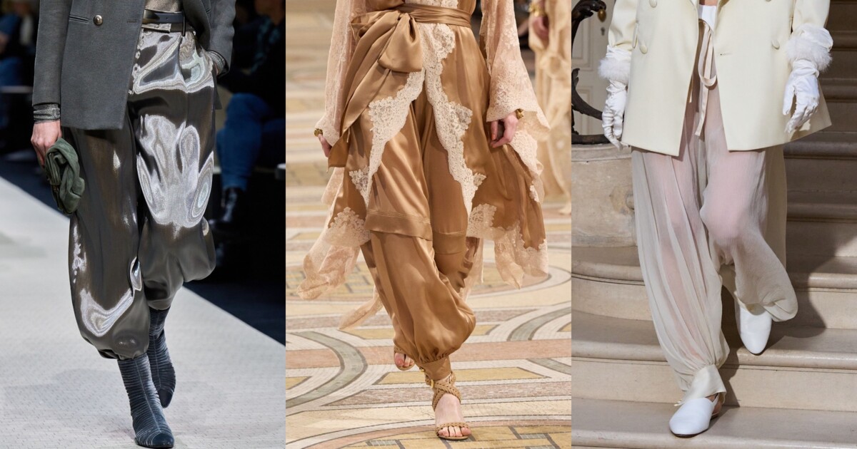 Chloé популяризували шаровари з мереживом та атласом, а Zimmermann у сезоні осінь-зима 2025/2026 зробили ставку на нейтральні відтінки з золотими деталями. Поєднання з блейзерами та кроп-топами робить їх ідеальними навіть для більш офіційних образів, а варіанти з блиском, прозорими вставками чи деталями в стилі нижньої білизни додають розкоші. Колекції Kenzo та Giorgio Armani підтверджують: штани-шаровари можуть стати найкращим вибором для стильного вечірнього образа.
