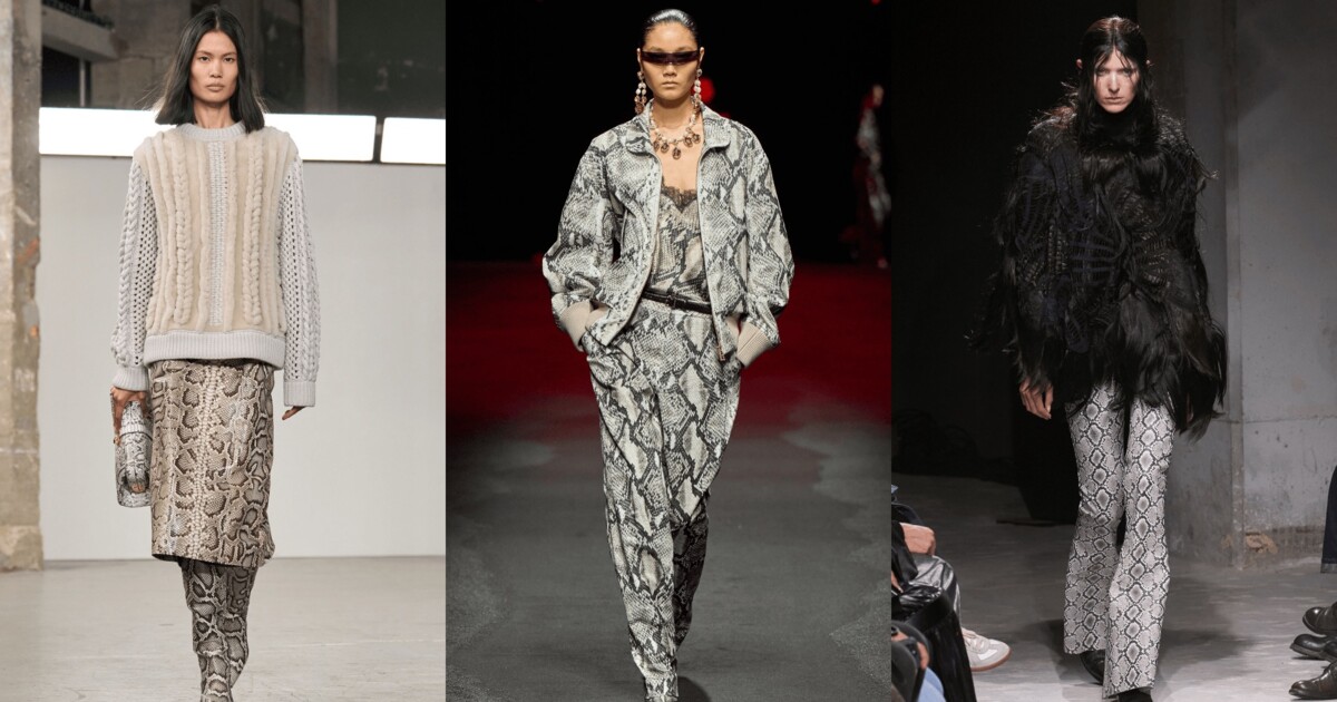 Універсальність зміїного принта дозволяє експериментувати зі стилями. Gabriela Hearst поєднали мідіспідницю з чоботами slouchy та сумкою з аналогічним візерунком, але в іншому відтінку, створюючи динамічний образ. До такого сету можна додати в’язаний светр, виходячи за межі класичних поєднань із джинсами чи чорними штанами.