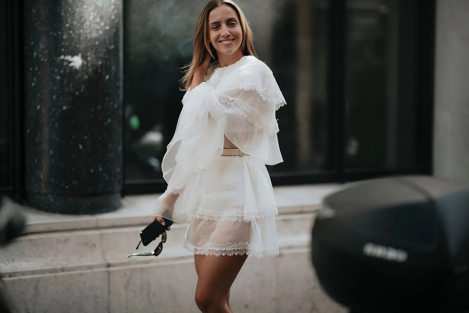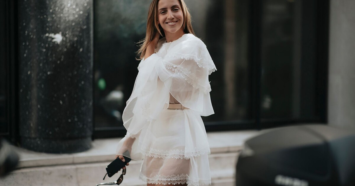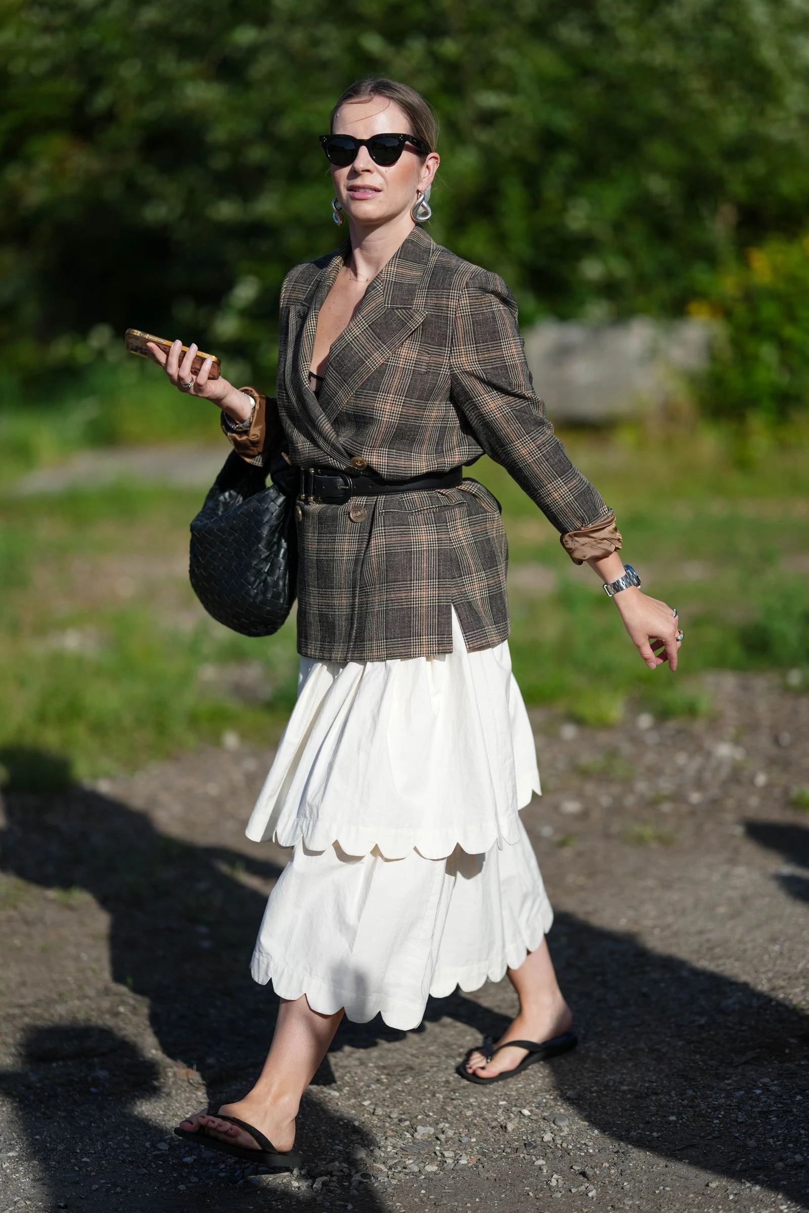 Мідіспідниця з подвійним подолом, блейзер, позичений в чоловічому гардеробі, і вʼєтнамки — три базові речі, які разом створюють ідеальне поєднання серпня. Модель також вписується в тренд "каскадних" спідниць, що стали віральними завдяки брендам на кшталт Chloé. Для більшої виразності можна додати тонкий ремінь і шкіряну плетену сумку — ідеальне натхнення для переосмислення літніх образів.