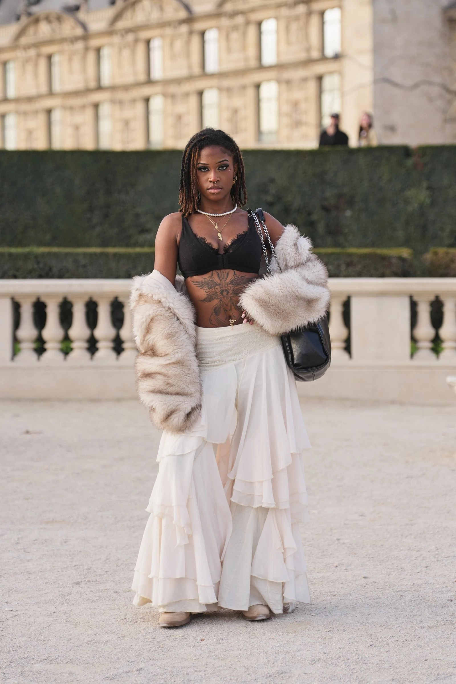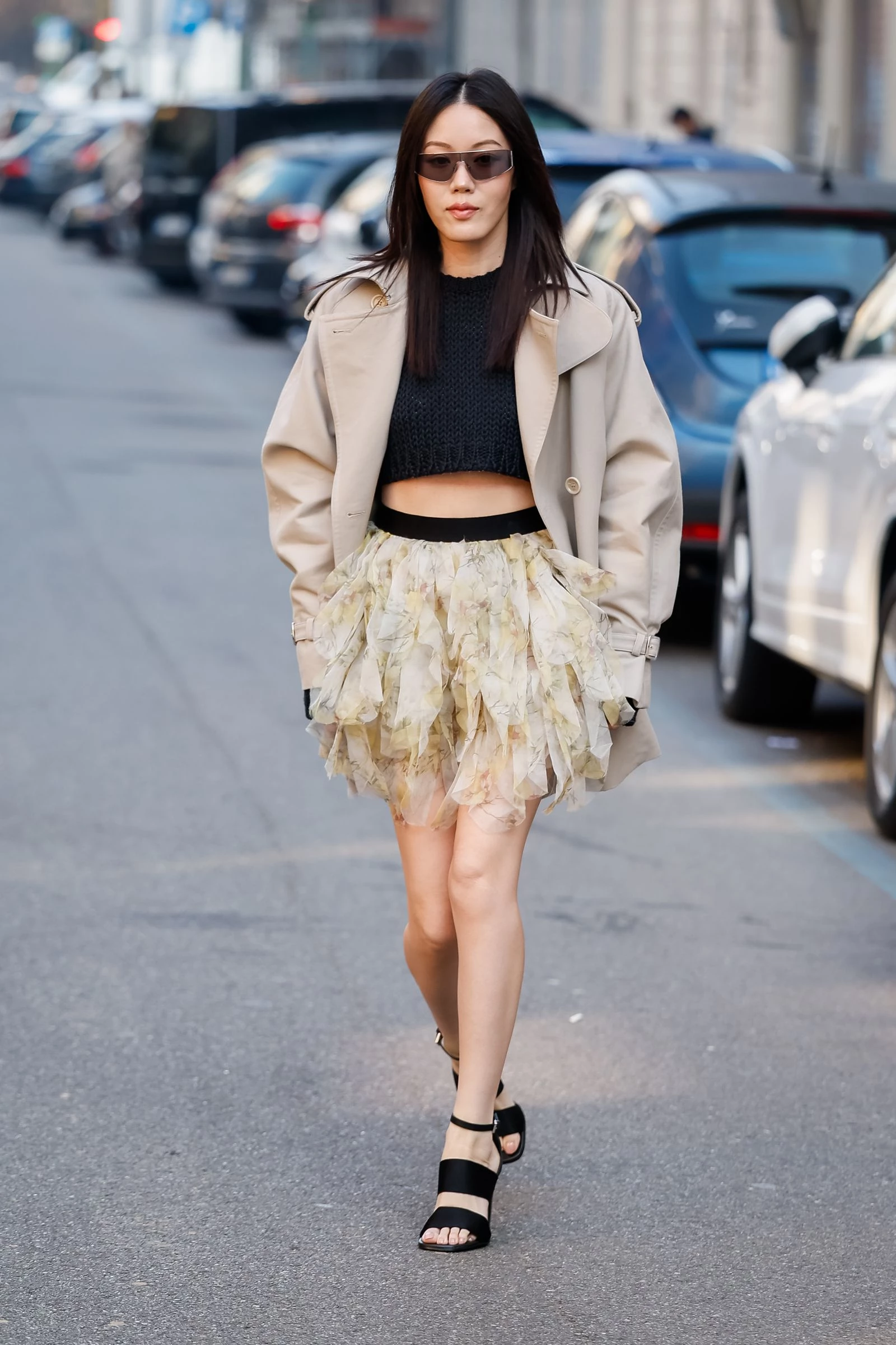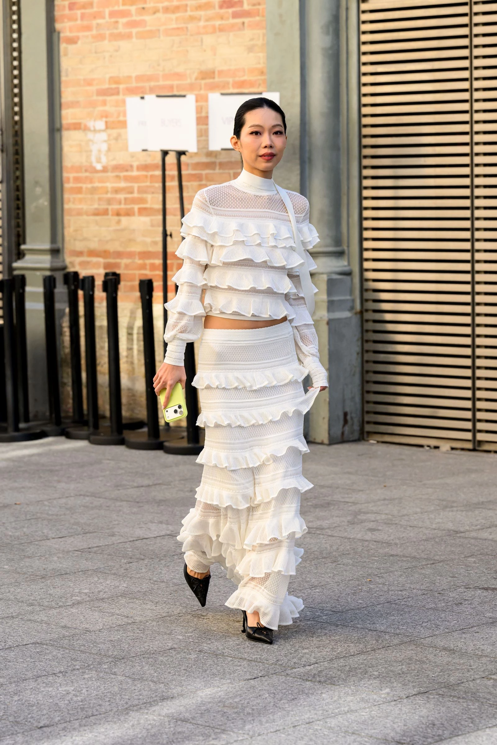 Спідниця з воланами повертається і в естетиці 2000-х – у форматі міні. Саме такі моделі активно з’являються на вулицях модних столиць: від образів із топами з вирізами до більш стриманих – із короткою чорною футболкою та укороченим тренчем. Босоніжки на підборах – головний стайлінг-трюк для візуального подовження силуету.