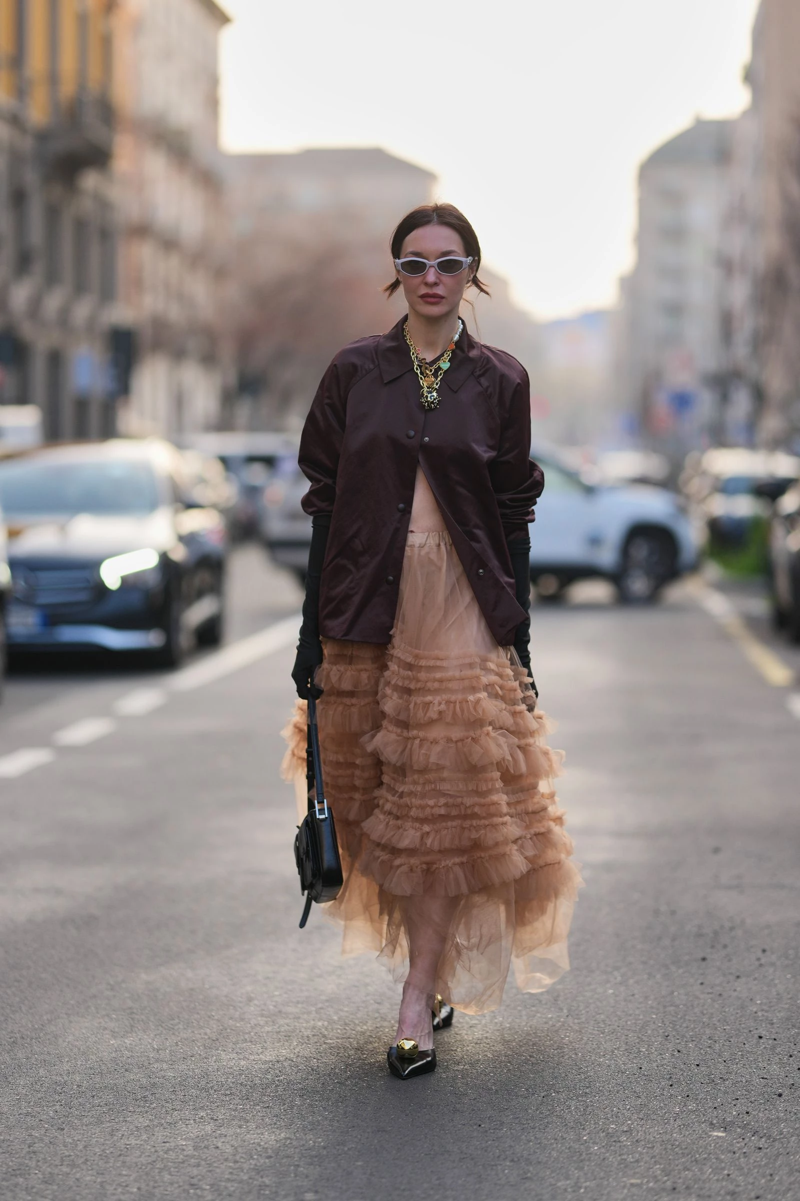 Ще один сміливий варіант – поєднувати спідницю з бра: як у стилі Y2K, так і в більш вишуканій інтерпретації від Prada. Спідниця-олівець із воланами по низу чудово працює з оверсайз-жакетом, а довга модель у молочному відтінку – з "пухнастим" верхнім одягом. Як бачимо, можливості для стилізації – практично безмежні.