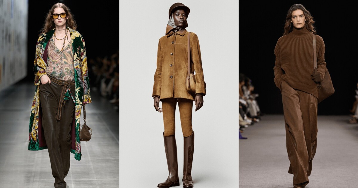 Згадка про замшу зазвичай асоціюється з торочками, ковбойськими чоботами й естетикою бохо. Але цього сезону дизайнери пропонують нове прочитання. Наприклад, Etro представили штани на високій посадці прямого крою в глибокому коричневому кольорі з ефектом потертості, доповнюючи їх плетеним ременем і квітковою блузою. Референс на 1970-ті стає більш вишуканим і сучасним.