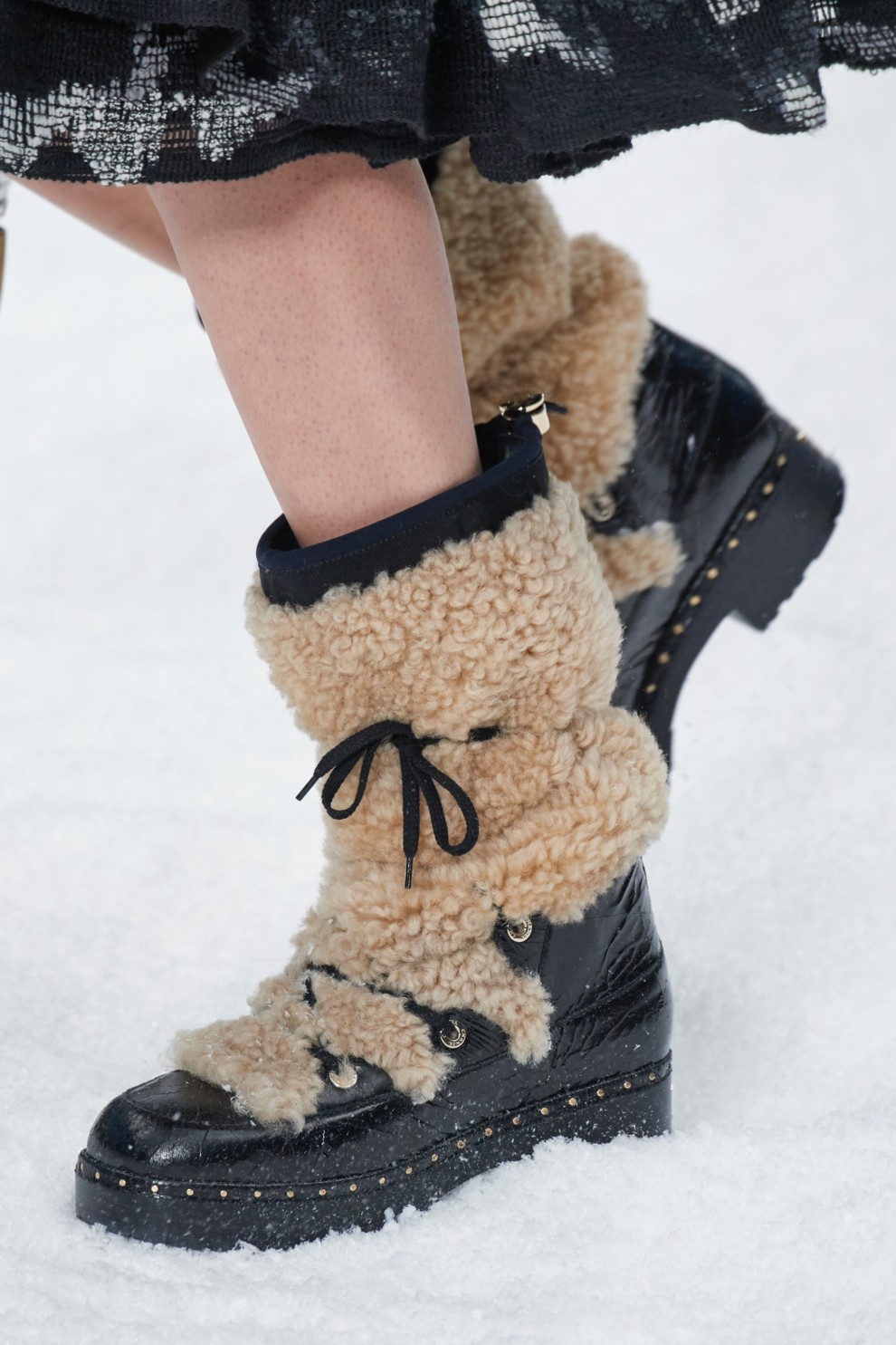 Tod's осінь-зима 2019/2020Цієї зими модні бренди пропонують взутися в об'ємні черевики з хутром, яке тепер не лише всередині взуття, а й зовні. Так, Кеті Голмс вже прислухалася до порад дизайнерів і придбала зимові черевики Chloé x Sorel. Схожі моделі можна знайти у Chanel – шкіряні черевики білого і чорного кольорів, декоровані овчиною для різких морозів. Тим часом у колекції Courreges з'явилися білосніжні черевики, що нагадують хутро єті.
