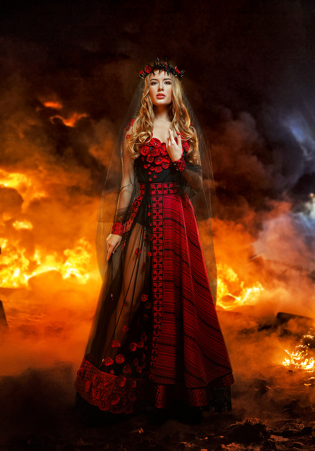 Для конкурса национальных платьев девушка привезла наряд украинского бренда Ruta c символичным названием "Невеста войны". По словам дизайнера Людмилы Бушинской, он олицетворяет Украину с молодой красивой девушкой, оплакивающей своего любимого, который погиб, защищая родную страну. Головной убор наряда разработала дизайнер и стилист Юлия Вирц.