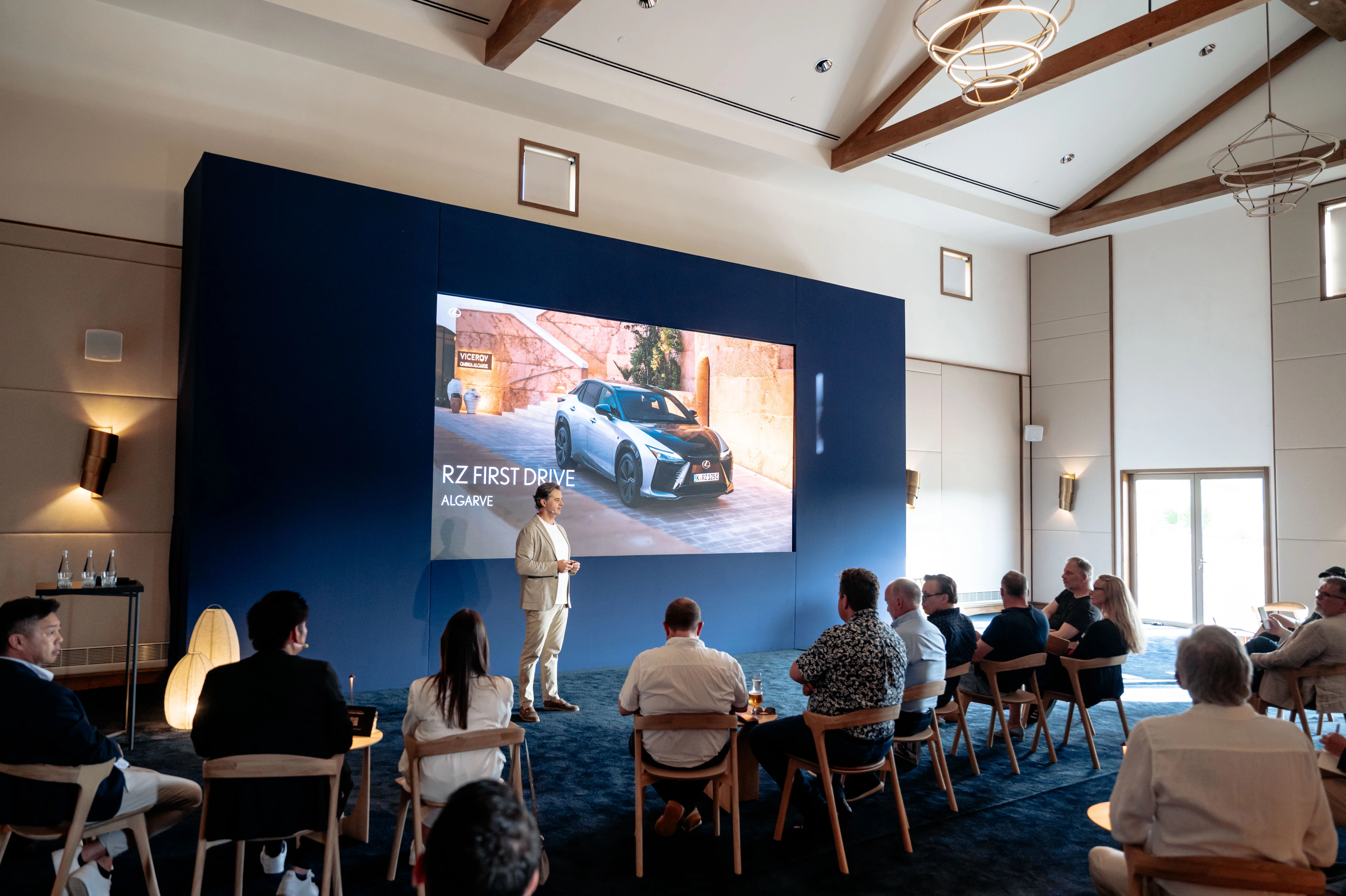 Наша перша зустріч з оновленим Lexus RZ відбулася в Алгарве – мальовничому містечку Португалії з автентичною атмосферою. В еко-готелі Viceroy Ombria Algarve, серед цитрусових дерев та звивистих стежок, команда Lexus влаштувала презентацію простонеба. Стриманий дизайн електромобіля, як завжди витриманий у стилі бренду, ідеально поєднувався з ретельно підготовленою локацією із фокусом на деталі. Під час події головний інженер моделі Шінья Іто презентував оновлений модельний ряд: RZ 350e з переднім приводом, RZ 500e з повним приводом і – вперше – F SPORT RZ 550e з унікальним дизайном керма, який одразу привернув мою увагу.