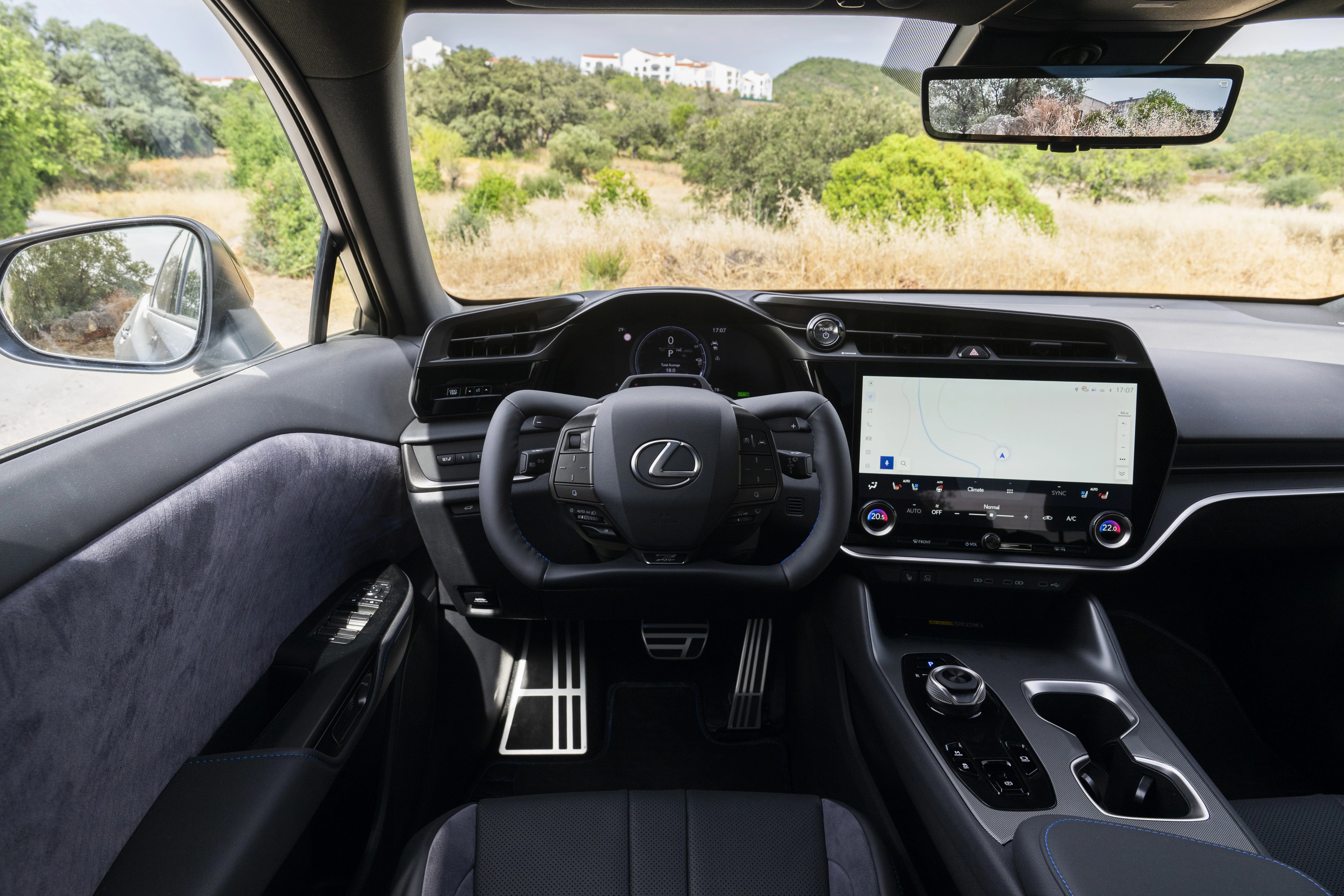 Нарешті – момент Х: я за кермом нового електромобіля F SPORT RZ. Натискаю на педаль – і він майже беззвучно, але впевнено демонструє свої переваги. Авто чудово тримається на дорозі навіть на високій швидкості, чітко реагуючи на кожен мій рух. До нового керма-штурвала без верхньої та нижньої частин традиційного кола звикаєш напрочуд швидко: щоб зробити повний оберт, достатньо повернути його всього на 200 градусів. Це майже повністю позбавляє потреби переставляти руки. Потужність у 408 к.с. дозволяє розігнатися до 100 км/год лише за 4,4 секунди, а максимальна швидкість становить 180 км/год.