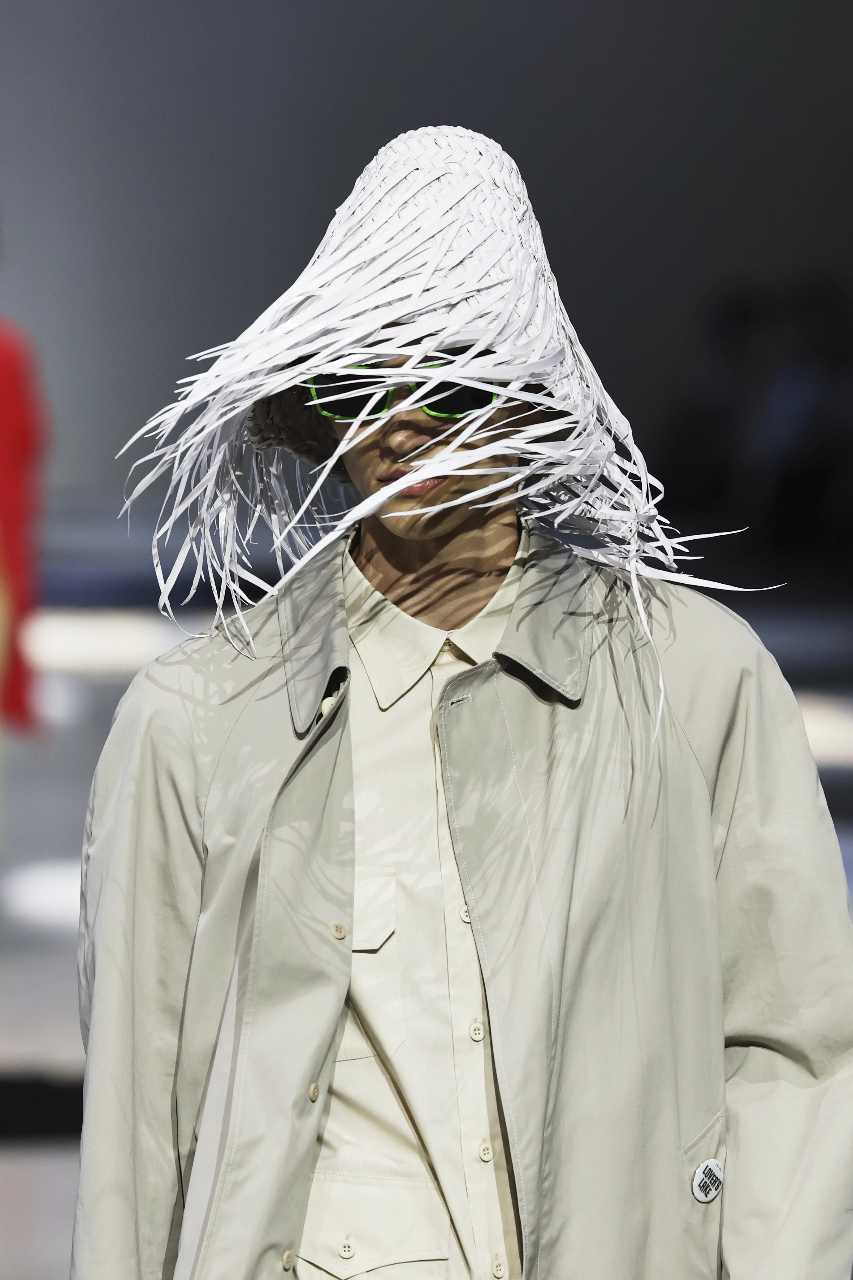 Окрему роль у колекції відіграли аксесуари. Усі капелюхи зроблені з ротанга, нагадували перевернуті квіткові горщики. Деякі з них мали навмисно "зіпсовані" деталі: бахрома по краях, нерівні лінії, розплетені частини. Ця структурна недбалість порушувала ідеальність силуету і скидала напругу. Аксесуари мали не декоративний вигляд, а виступали як тонкий натяк проти надто вилизаного чоловічого образу.