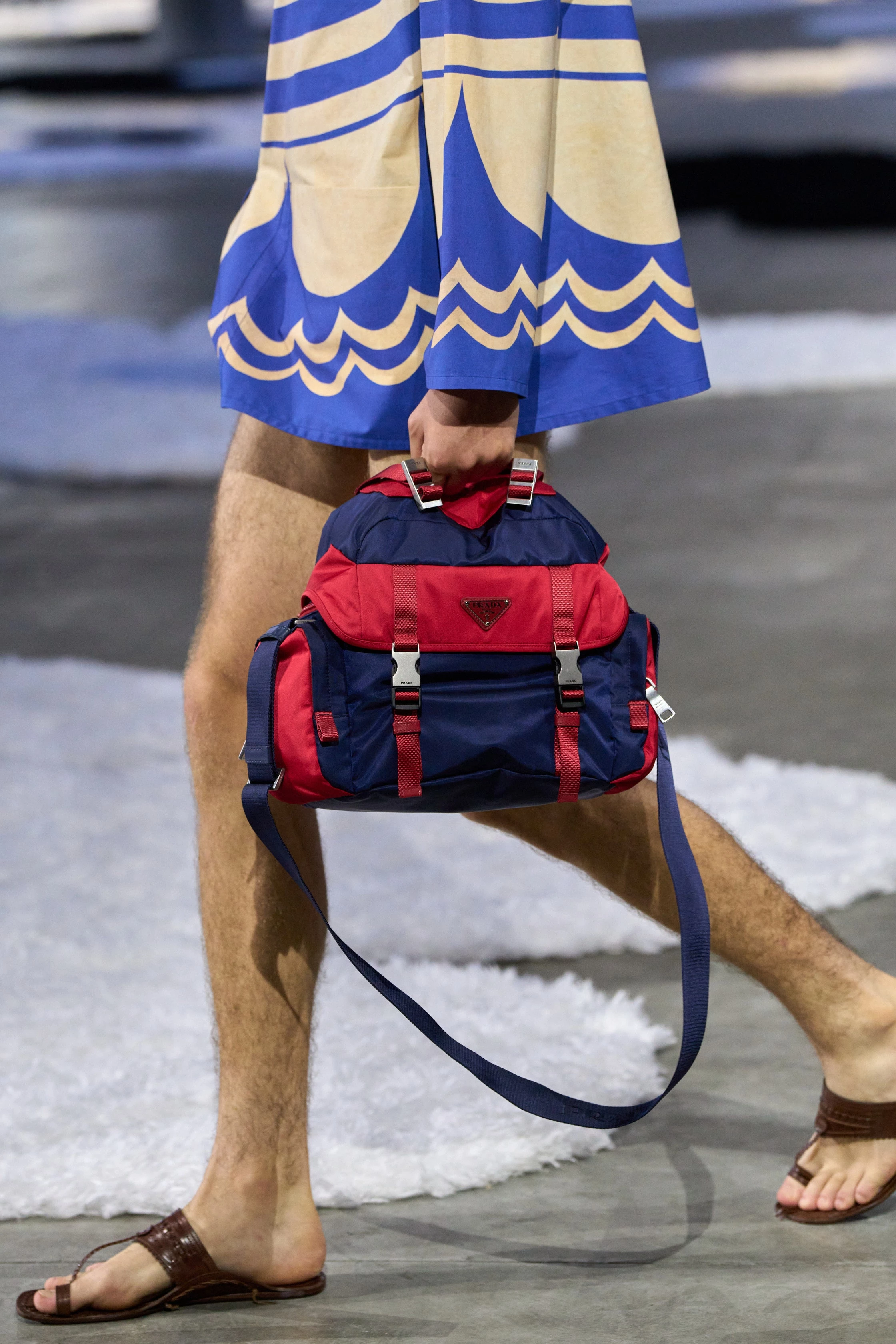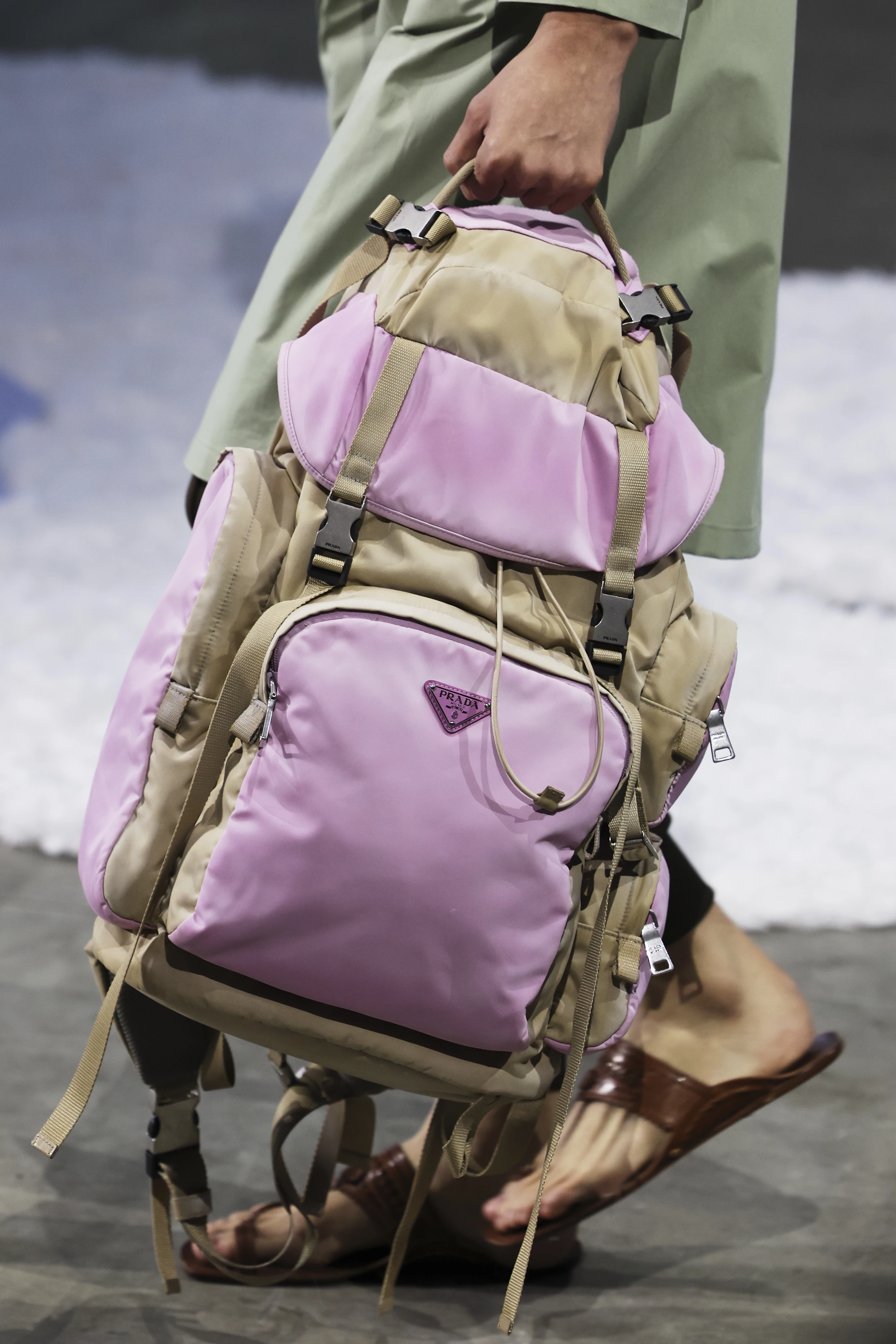 Сумки — ще один важливий акцент. Виготовлені з класичного нейлону Prada циліндричні моделі, рюкзаки, сумки з великою кількістю блискавок, застібок і карабінів мали вигляд повноцінних туристичних аксесуарів, але з ідеальною стилізацією.