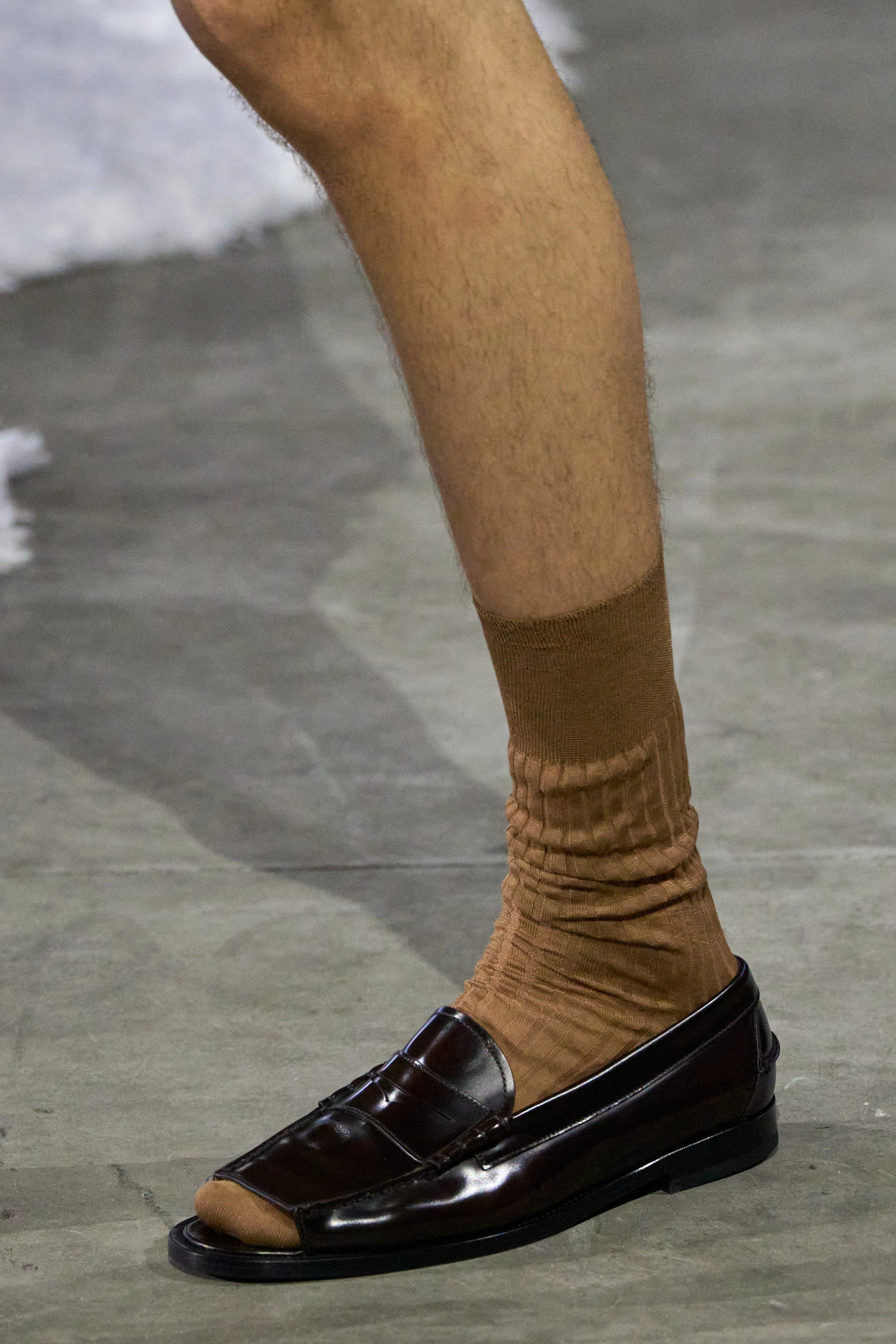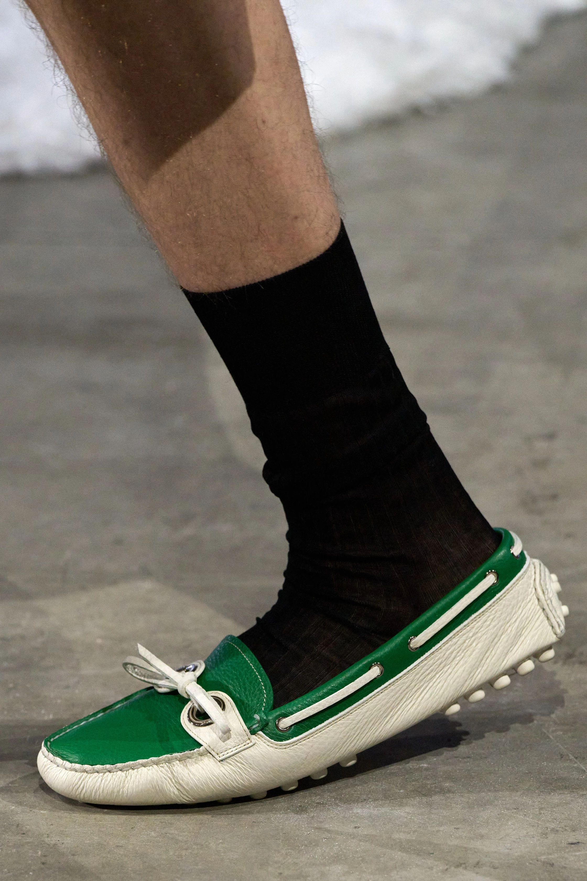 Взуття — практичне і дуже літнє. У колекції були сандалі, гумові кеди, шкіряні мокасини, топсайдери, класичні оксфорди та навіть пляжні капці. Усі моделі мали тонку, майже непомітну підошву — ніби спеціально створені для прогулянок уздовж берега.