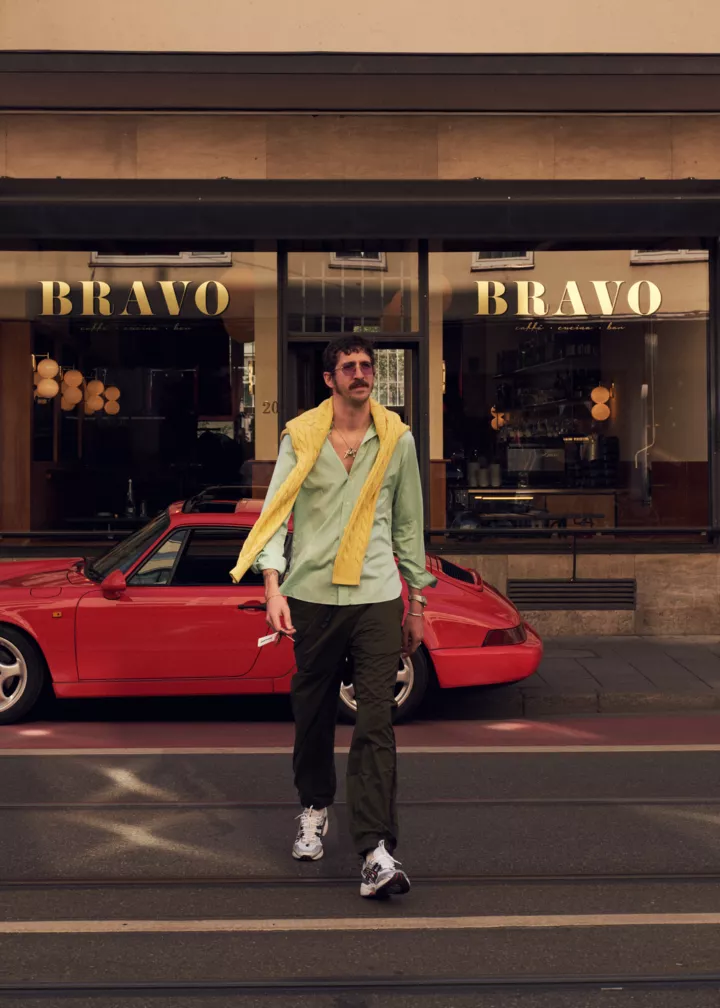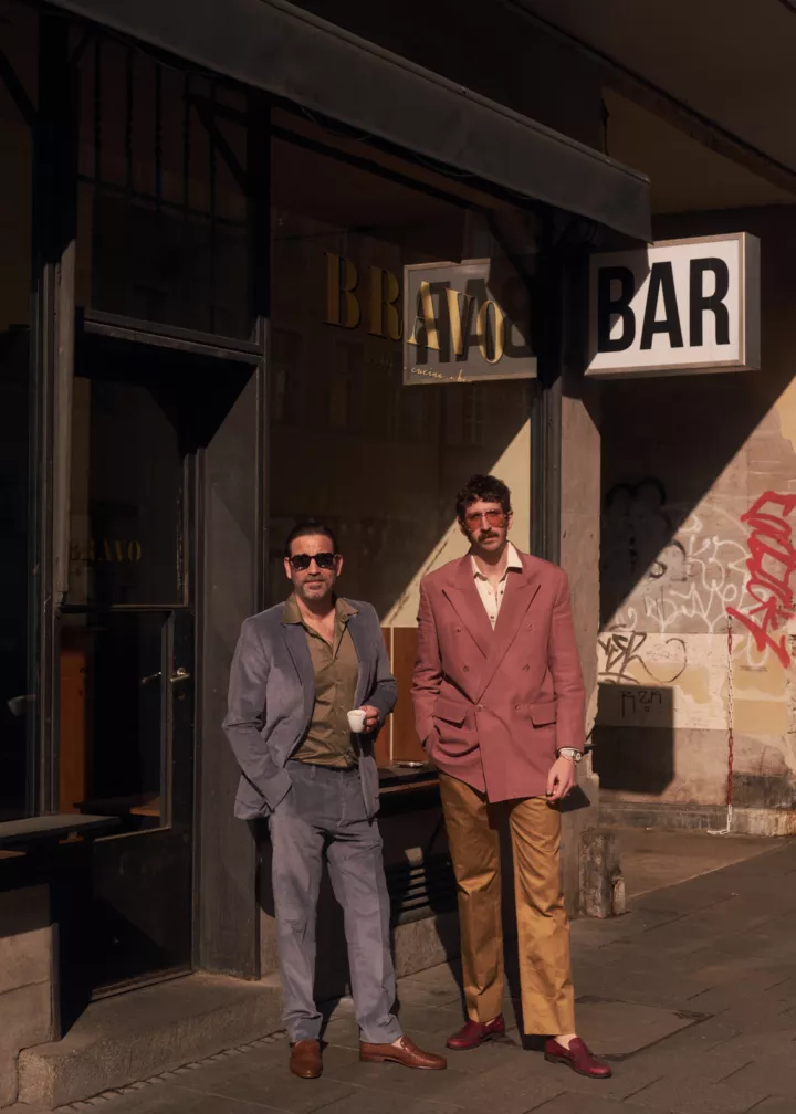 Втомившись від монотонності карантинного життя, німецький фотограф Макс фон Брау вирішив зробити зйомку-присвяту італійській Dolce Vita. З цією метою він вирушив у модний мюнхенський Bravo Bar — серія світлин, стилізована Яною Гутше, стала оммажем життєрадісного стилю його власників. Герої зйомки і перші особи Bravo Bar, Марлон Шулер і Давид Стабек, на двох показують, як хвацько і без вагань носити рожеві двобортні піджаки, террактові штани, спортивні куртки з відливом і оправи-авіатори з кольоровими скельцями. Важко повірити, що ці модники в барвистих брючних костюмах — і не італійці зовсім. Що лише свідчить на користь їхніх сарторіальних трюків — так ефектно гуляти в брючних двійках і хизуватися лоферами на босу ногу можуть, мабуть, тільки італійські гульвіси і кінозірки. Нам є чому повчитися.
