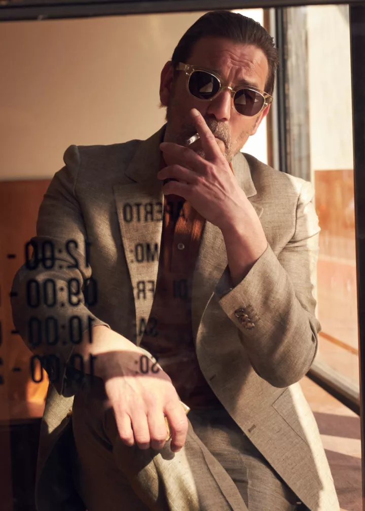 Бавовняний піджак, Paul Smith; джинсова сорочка, Belstaff; бавовняні брюки, Prada; окуляри, Cartier