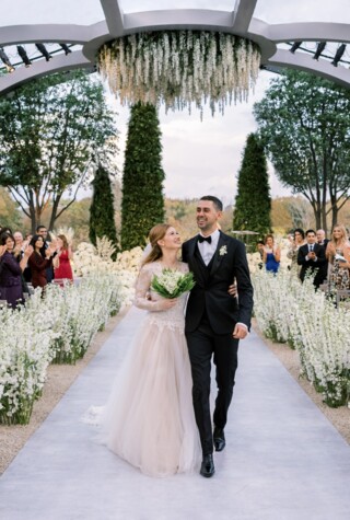Ліворуч сукня Reem Acra, праворуч Одрі Гепберн у Sorelle FontanaПершим чоловіком Одрі Гепберн став американський актор Мел Феррер. Вінчання відбулося 25 вересня 1954 року в невеличкій капличці швейцарського містечка Бюргеншток. Пара покликала лише найближчих розділити з ними радість. Для весільного образу Одрі вибрала білу сукню Pierre Balmain у вікторіанському стилі: легкі рукави, високий комір, пишна спідниця й високі рукавички. Голову Гепберн прикрашав вінок з гвоздик і конвалій. Культовий образ актриси досі знаходить відбиття в сучасних колекціях брендів, наприклад у весільній сукні Carolina Herrera весна-літо 2020.